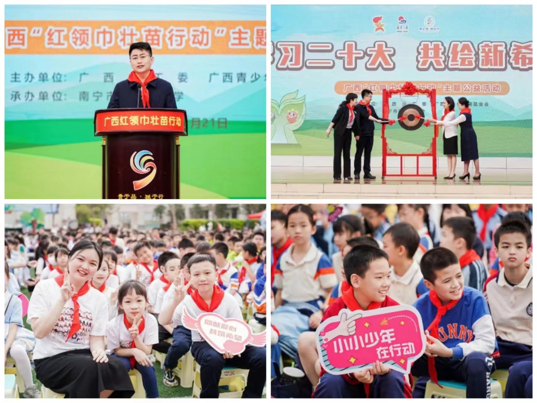 为深入学习宣传党的二十大精神,贯彻落实习近平总书记寄语希望工程重要精神,落实共青团中央《关于大力推进新时代希望工程事业发展的若干意见》及《全面构建新时代少先队社会化工作体系实施方案(2022—2025年)》要求,2023年3月,广西少工委、广西青少年发展基金会联合设立广西红领巾专项基金,开展“红领巾壮苗行动”主题公益活动,通过组织化、社会化的资金募集方式,面向社会开展爱心义卖、爱心捐赠等主题公益活动,鼓励发动社会爱心企业参加线上线下活动募捐善款。