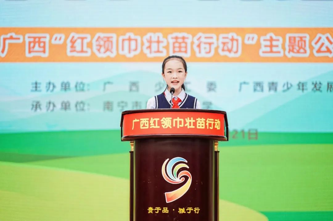 在飘扬的五星红旗下,南宁市桂雅路小学少先队员代表向全区少先队员、辅导员老师们发出倡议,号召大家一起行动起来,积极参与到“红领巾壮苗行动”公益项目中。