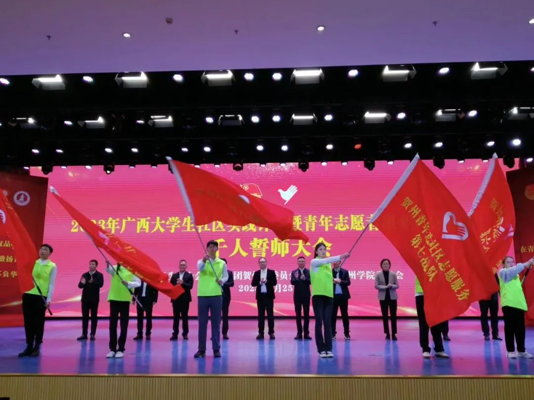 3月25日,由广西学生联合会、共青团贺州市委员会、共青团贺州学院委员会共同主办的2023年广西大学生社区实践计划暨青年志愿者服务社区行动千人誓师大会在贺州学院地方民族文化研究中心报告厅举行。