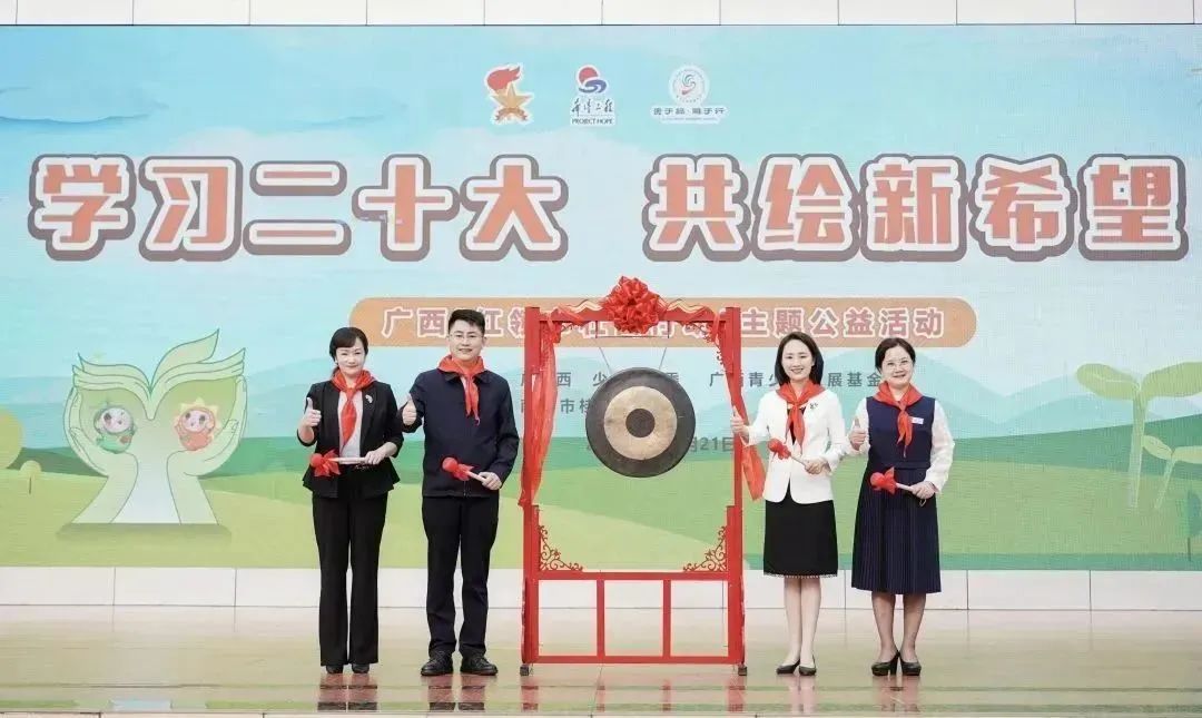 3月21日,“学习二十大 共绘新希望”——广西“红领巾壮苗行动”主题公益活动统一行动日主会场的活动在南宁市桂雅路小学举行。共青团广西区委员会副书记荣丽伟出席活动并讲话,为公益集市“鸣锣开市”,14个地市少工委负责同志及南宁市桂雅路小学4600余名师生现场参加活动。