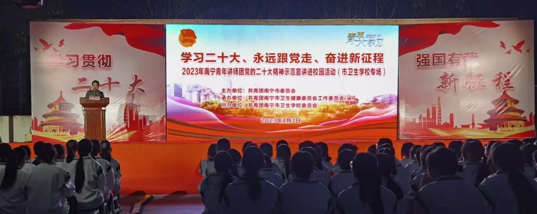 4月7日,南宁青年讲师团党的二十大精神示范宣讲活动在南宁市卫生学校启动。本次示范宣讲以进学校、进企业、进工地、进社区、进农村(新时代文明实践场所)、进新经济组织和新社会组织“六进”为主要形式,深入基层团组织、各行业各系统面对面、小规模、接地气讲清、讲实、讲活党的二十大精神,切实做好习近平新时代中国特色社会主义思想青年化阐释。