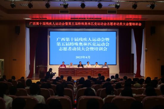 4月4日,由共青团贵港市委员会牵头,志愿者工作组在广西工业职业技术学院(二校区)举办广西第十届残疾人运动会暨第五届特殊奥林匹克运动会志愿者动员大会暨培训会。