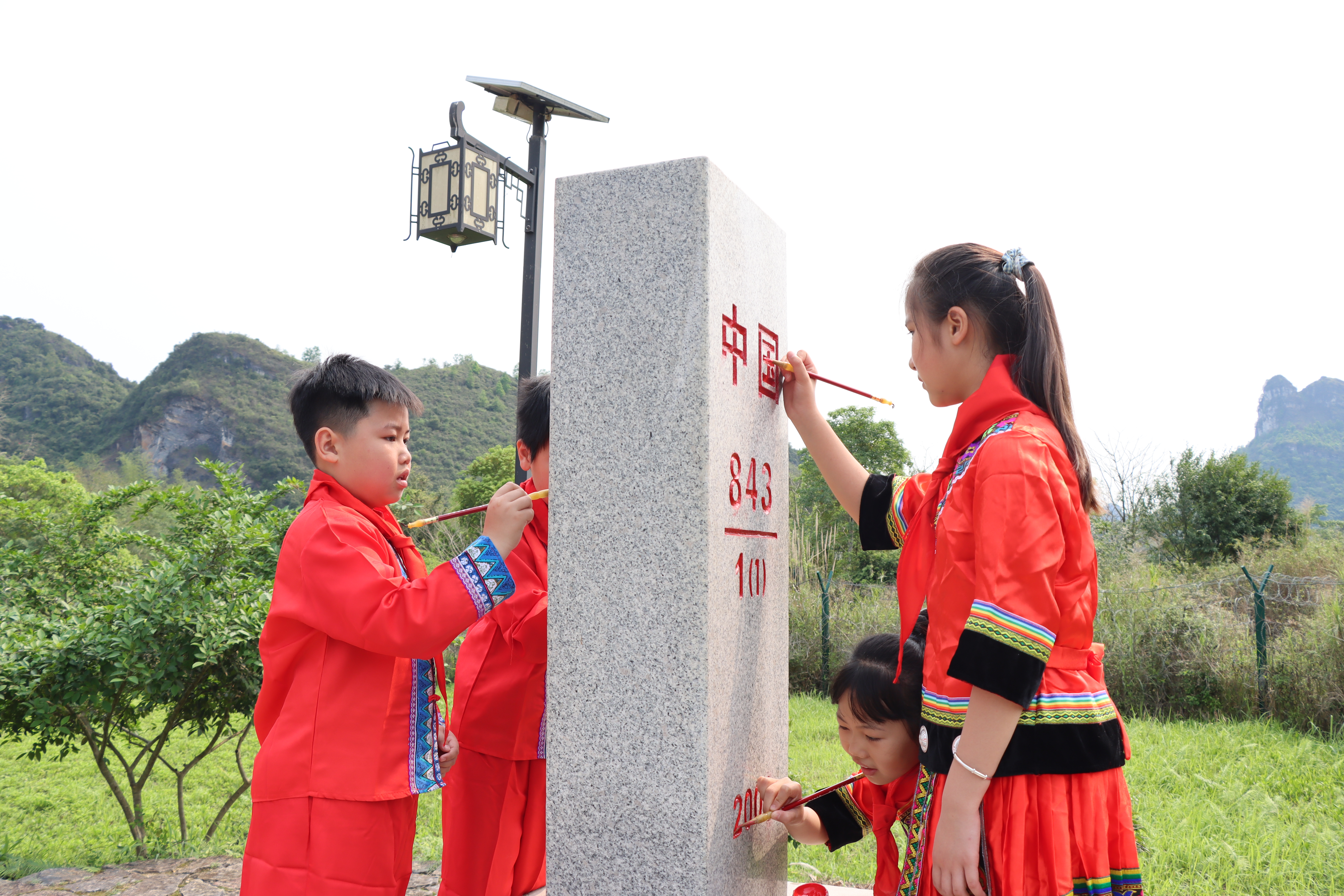 活动中,举行基地授牌仪式、为校外辅导员颁发聘书、参观“百姓门”和党史馆、开展我爱界碑爱国主义教育活动;少先队员们重温入队誓词并为界碑擦灰描红等方式,引导少先队员厚植爱党、爱国的情感,让红色基因、革命薪火代代相传。活动最后少先队员们还开展边境民族体育活动“抛绣球”。