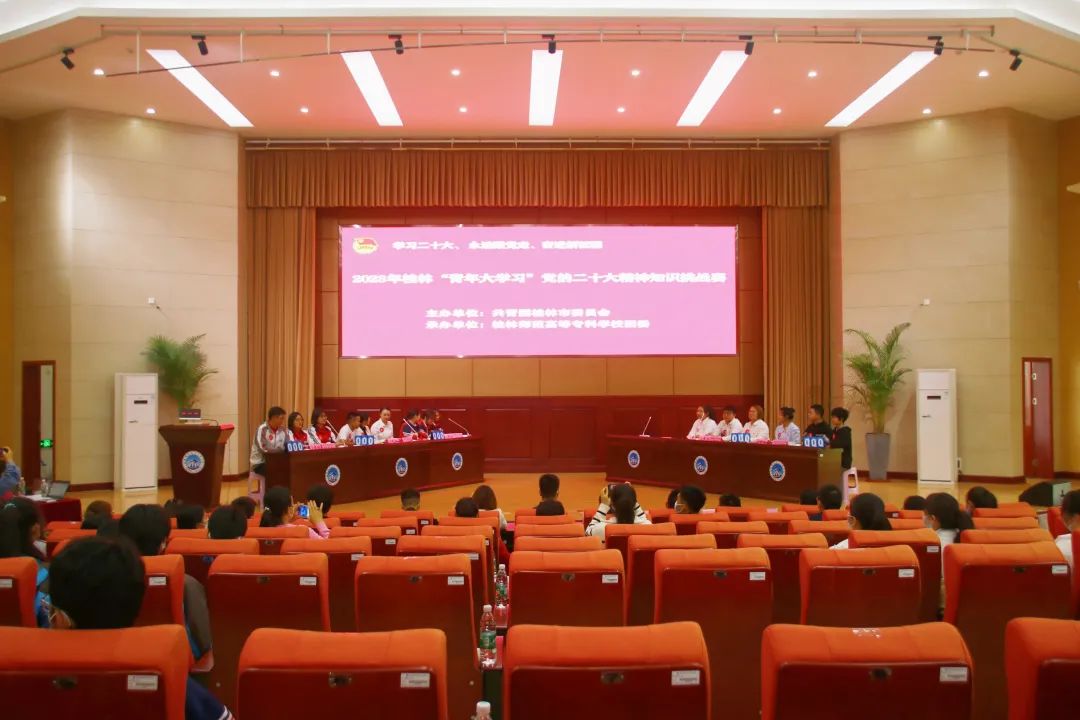 5月23日,由共青团桂林市委员会、桂林师范高等专科学校团委联合举办的“学习二十大、永远跟党走、奋进新征程”——2023年桂林“青年大学习”党的二十大精神知识挑战赛在桂林师范高等专科学校大报告厅举行。