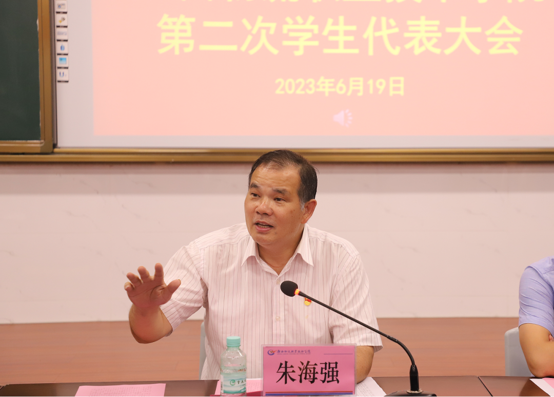 朱海强在会上致辞,他肯定了学生会过去一年以来团结引领全校青年学子在思想政治引领、志愿服务、专业竞赛、学术创新、校园文化建设等方面开展的工作。他勉励与会代表们要“爱国报国”,树立服务初心,把对祖国、对人民的情感融入对学业、事业的追求中;要“勤奋学习”,不断充实自己、提高自己、丰富自己;要“深入实践”,积极参与各种有益的社会实践活动;要“奉献社会”,多做关心集体、热心公益、扶贫济困、见义勇为的好事,为形成文明进步的良好社会风尚贡献一份青春力量。