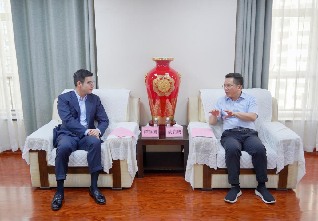 近日,香港新界青年联会主席谭镇国一行拜访广西青年联合会,广西青年联合会名誉主席蒙启鹏出席会见。