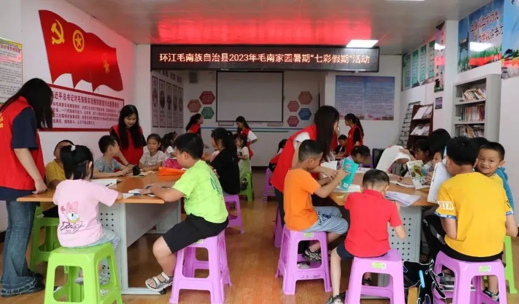 7月19日,由共青团环江毛南族自治县委员会组织的2023年“七彩假期”暑期公益课堂分别在毛南家园城西、城北安置区正式开课。