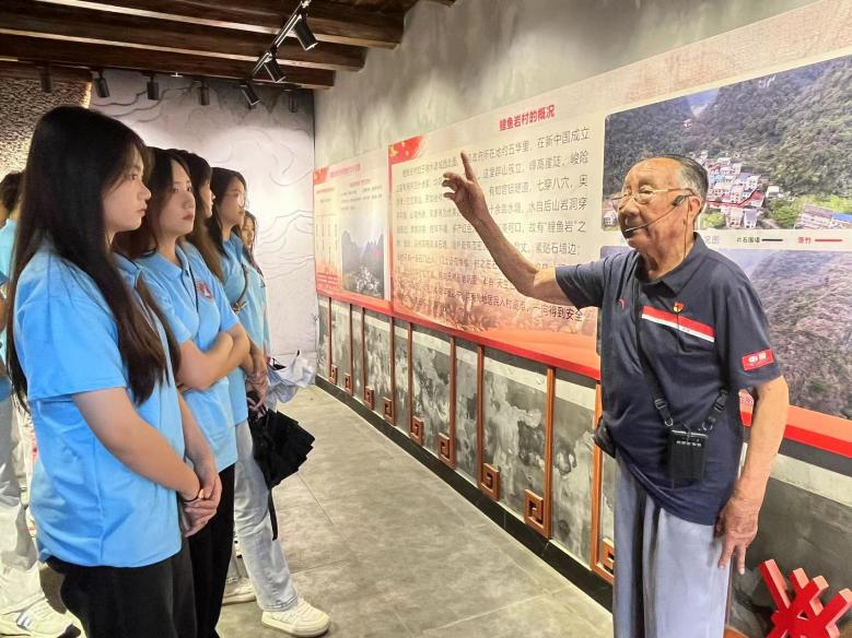 最后一站,服务队一边唱着红歌,一边爬山,顺利抵达融水县鲤鱼岩抗战纪念馆,这里承载了当年鲤鱼岩村人民抵抗日寇五次攻打的英勇历史。队员们踏上红色之旅,逐一参观了70多年前村民自制的抗战“武器”以及生产器皿和农具,纷纷感慨,当年利用如此简陋的装备抵抗日寇7个多月的盘踞是多么不易。参观完纪念馆的文物和史料记载,队员们坐在庭院的小板凳上,认真听9旬高龄的老党员曹议讲述当年鲤鱼岩村群众抗战的故事,缅怀红色岁月,感悟初心使命。队员们深刻认识到读万卷书,不如行往里路,表示要以红色为底色,弘扬老一辈不畏艰险、迎难而上的革命精神,以更加饱满的精神面貌,投入到学习当中,努力练就本领助力国之发展。