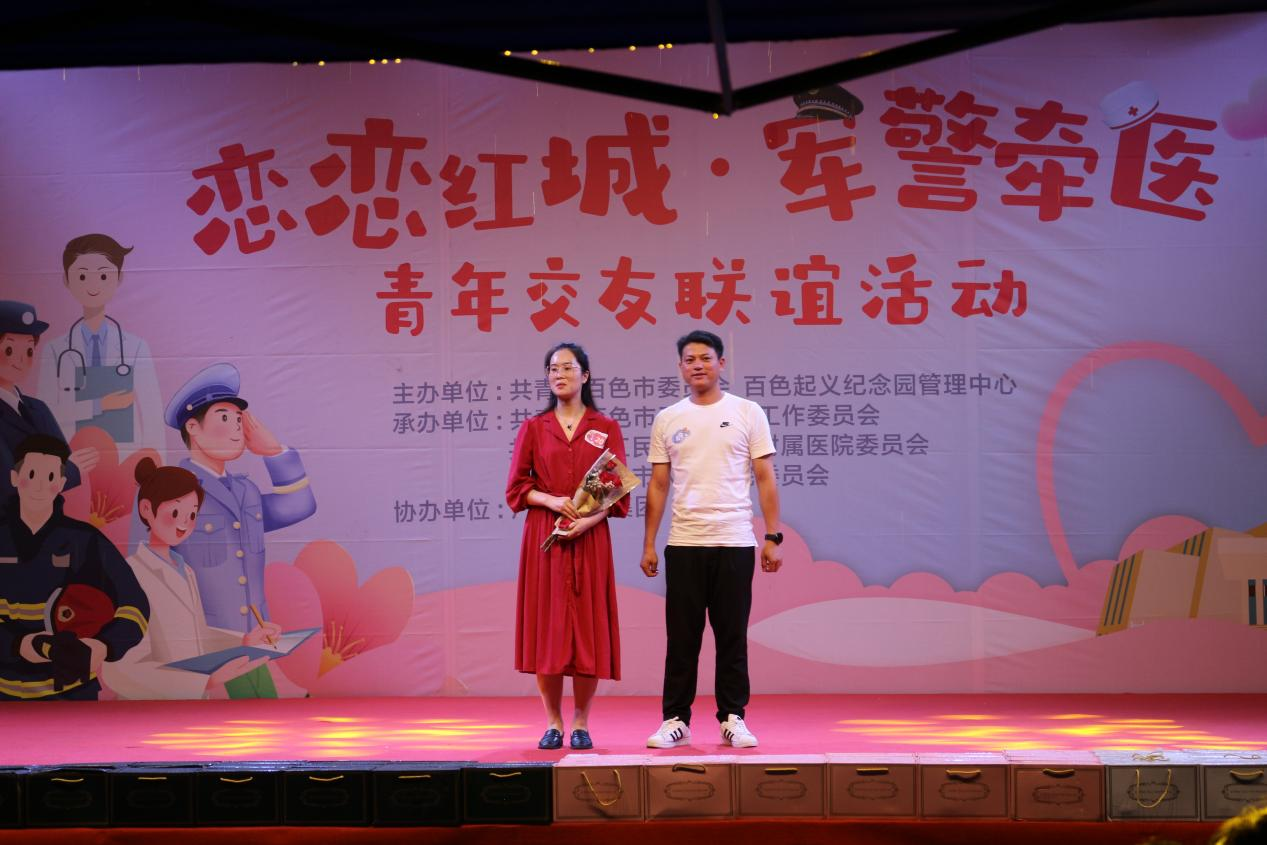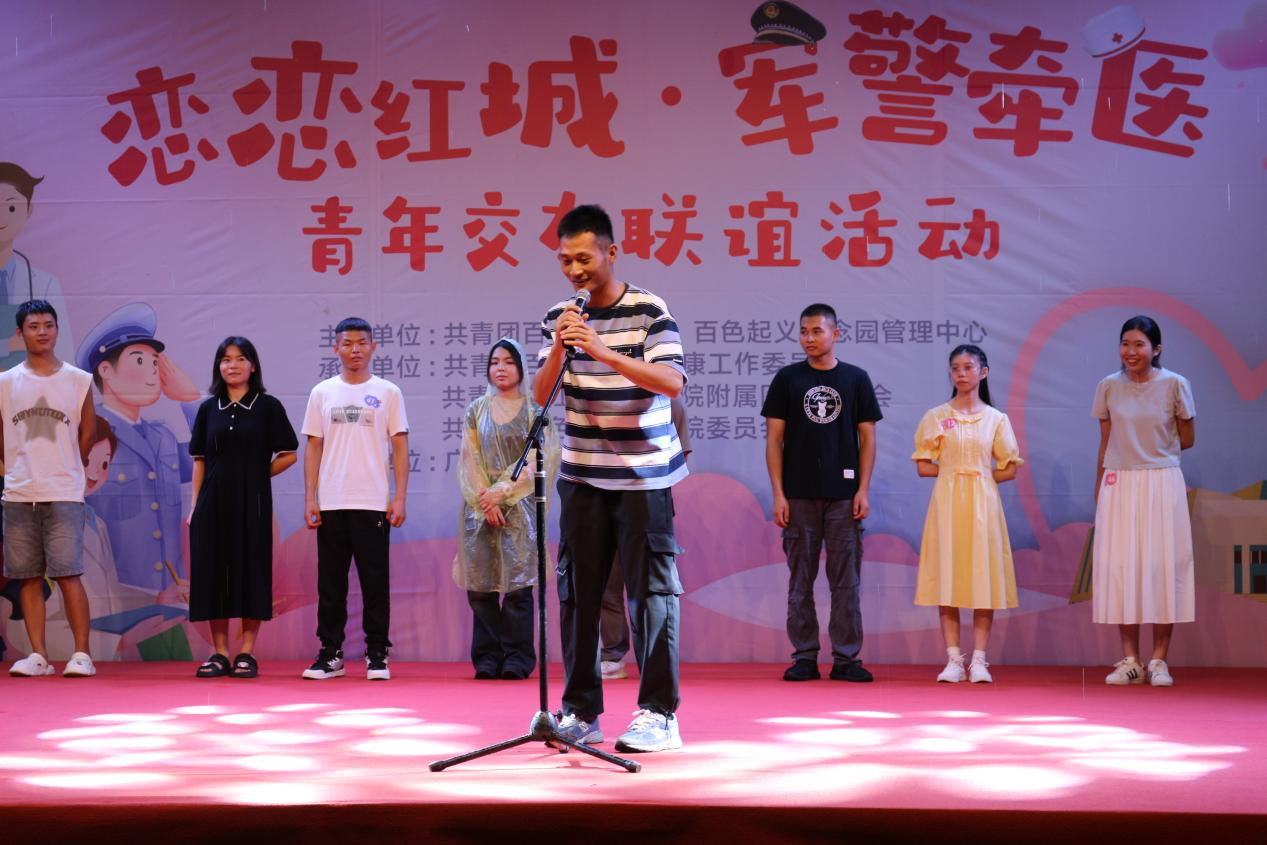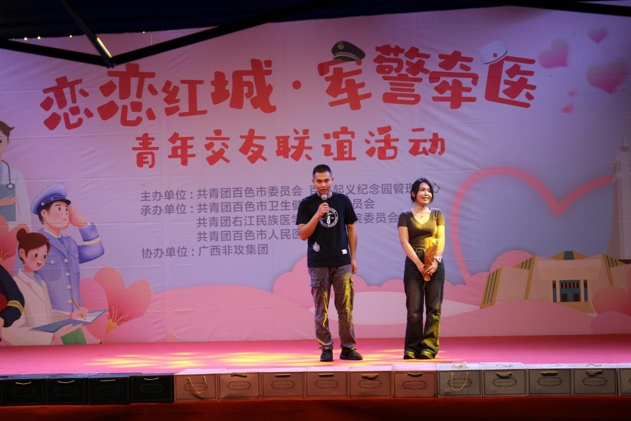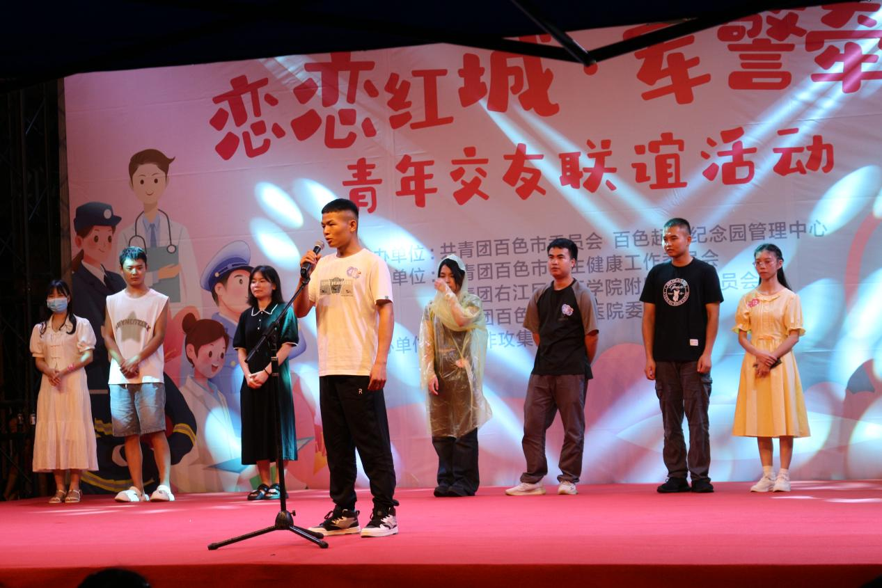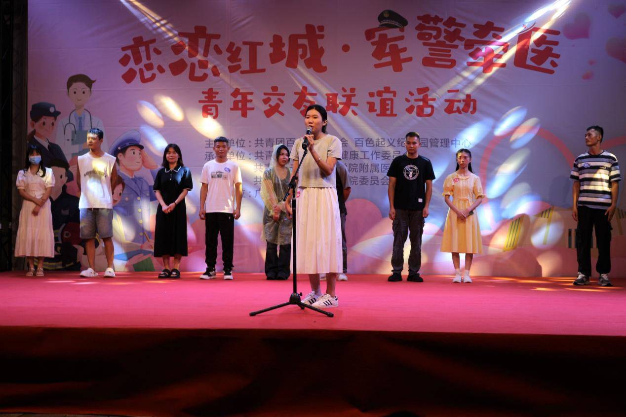 为了加强双拥共建,促进军地团结,搭建军地青年联谊交友平台,引导青年树立正确的婚恋观,不断提升青年在百色工作生活的幸福感、获得感。8月1日晚,共青团百色市委员会、百色起义纪念园管理中心、百色市卫生健康团工委、右江民族医学院附属医院团委、百色市人民医院团委、广西非攻集团于百色市解放街联合举办百色市“恋恋红城·军警牵医”青年交友联谊活动。