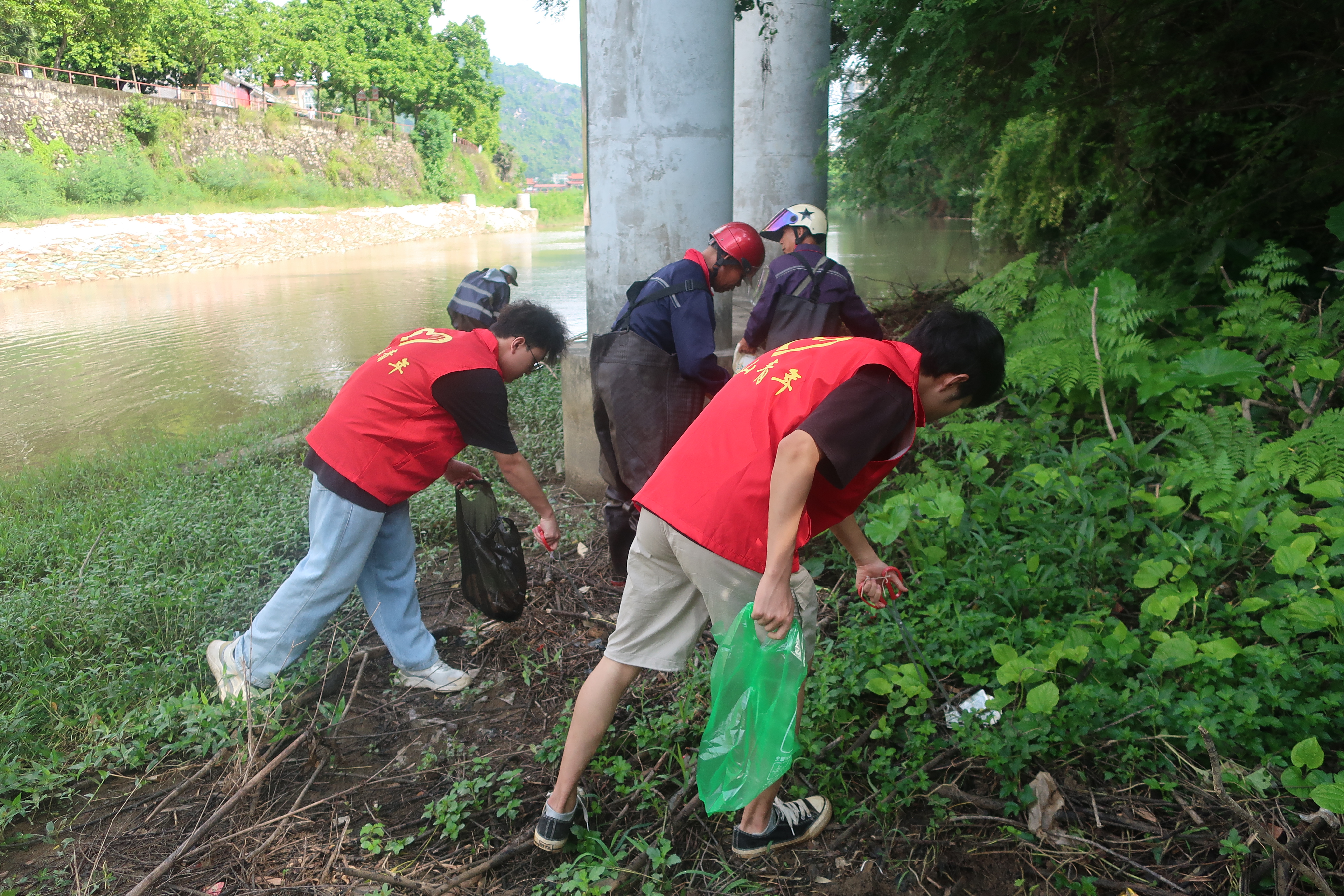 志愿者们和工作人员一起清理河道垃圾
