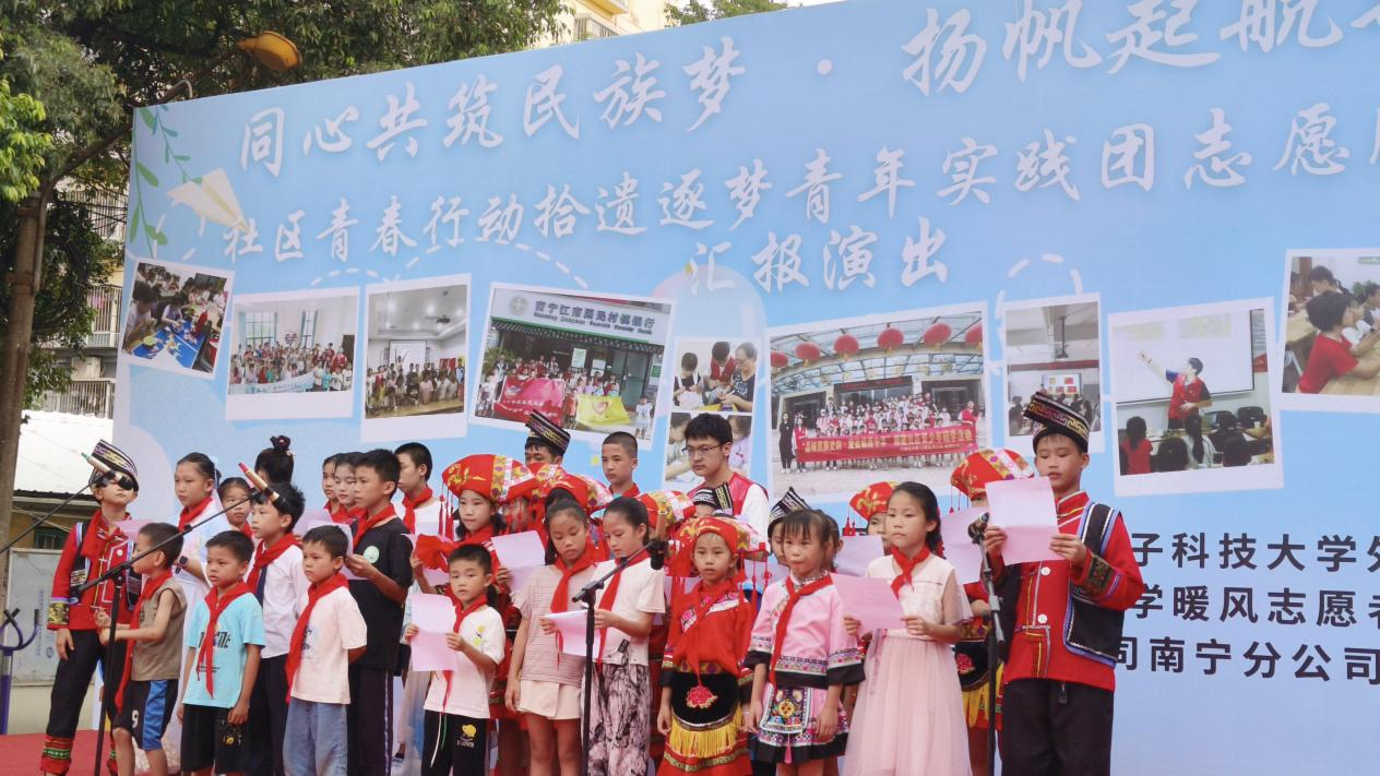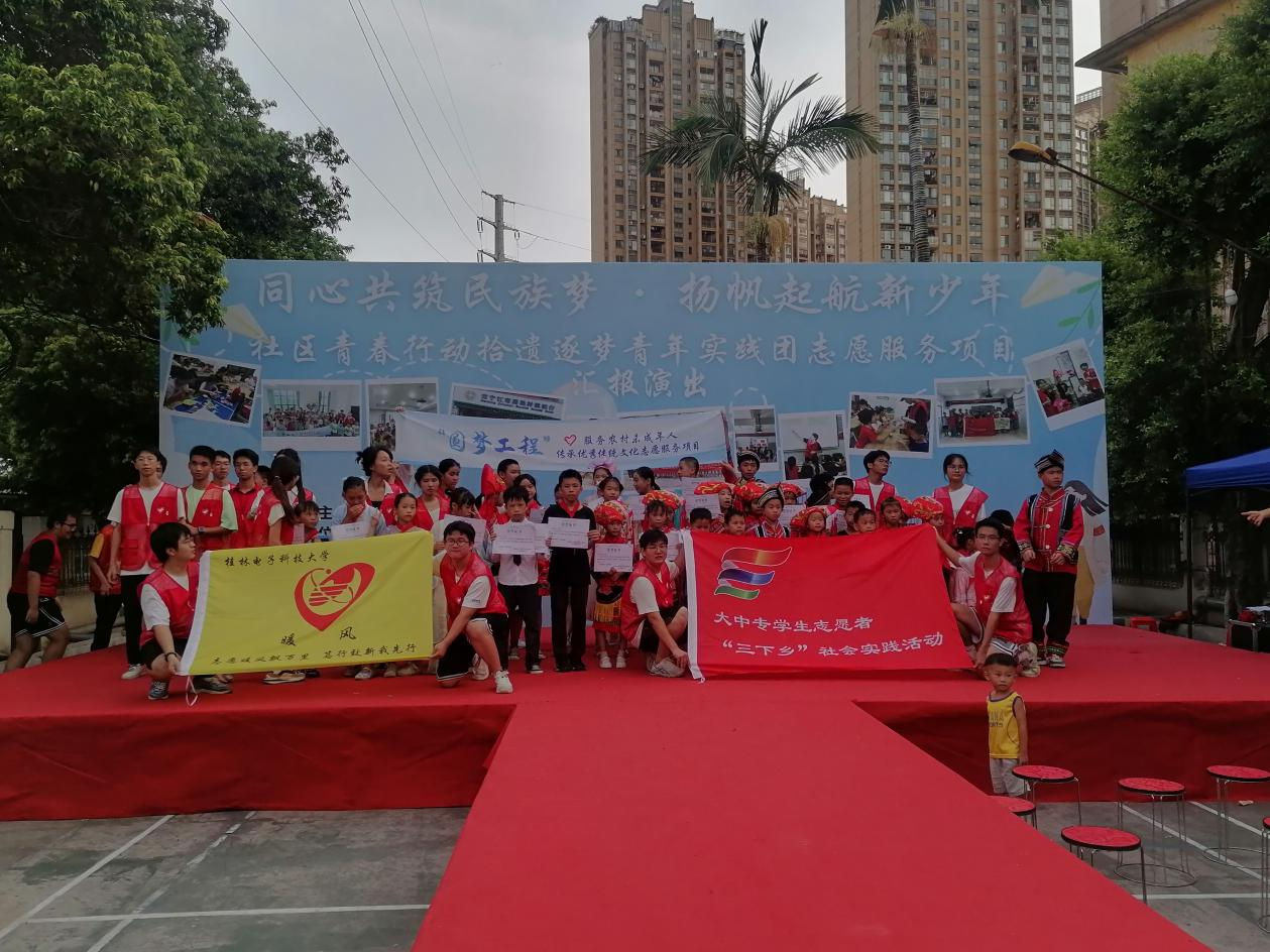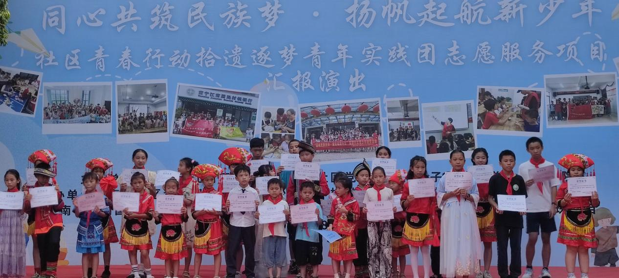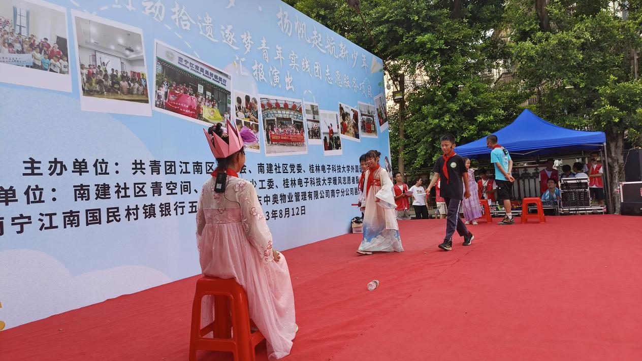 8月12日,活动的最后一天,拾遗逐梦青年团全体成员与共青团江南区委员会、南建社区党委等多个单位联合举办,共同开展以“同心共筑民族梦·扬帆起航新少年”为主题的社区青春行动汇报演出。