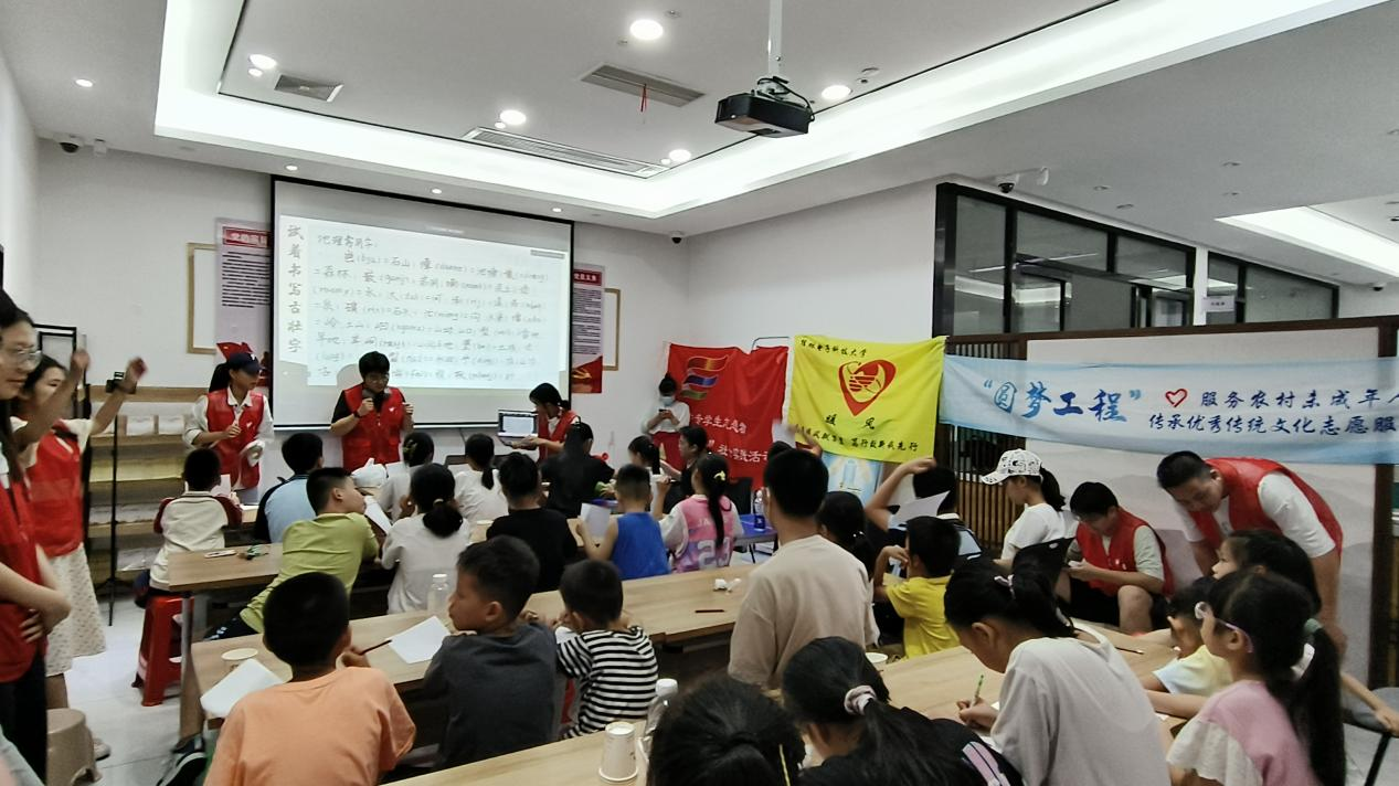 壮族历史文化课程中,青年团们与孩子们共同学习书写壮字;