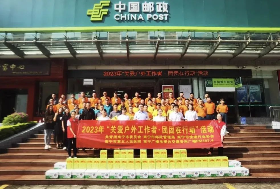 8月16日,共青团南宁市委员会联合南宁市邮政管理局、南宁市快递行业协会、南宁市第五人民医院、南宁广播电视台交通音乐广播FM107.4在南宁市保爱邮政所开展2023年“关爱户外工作者·团团在行动”活动。