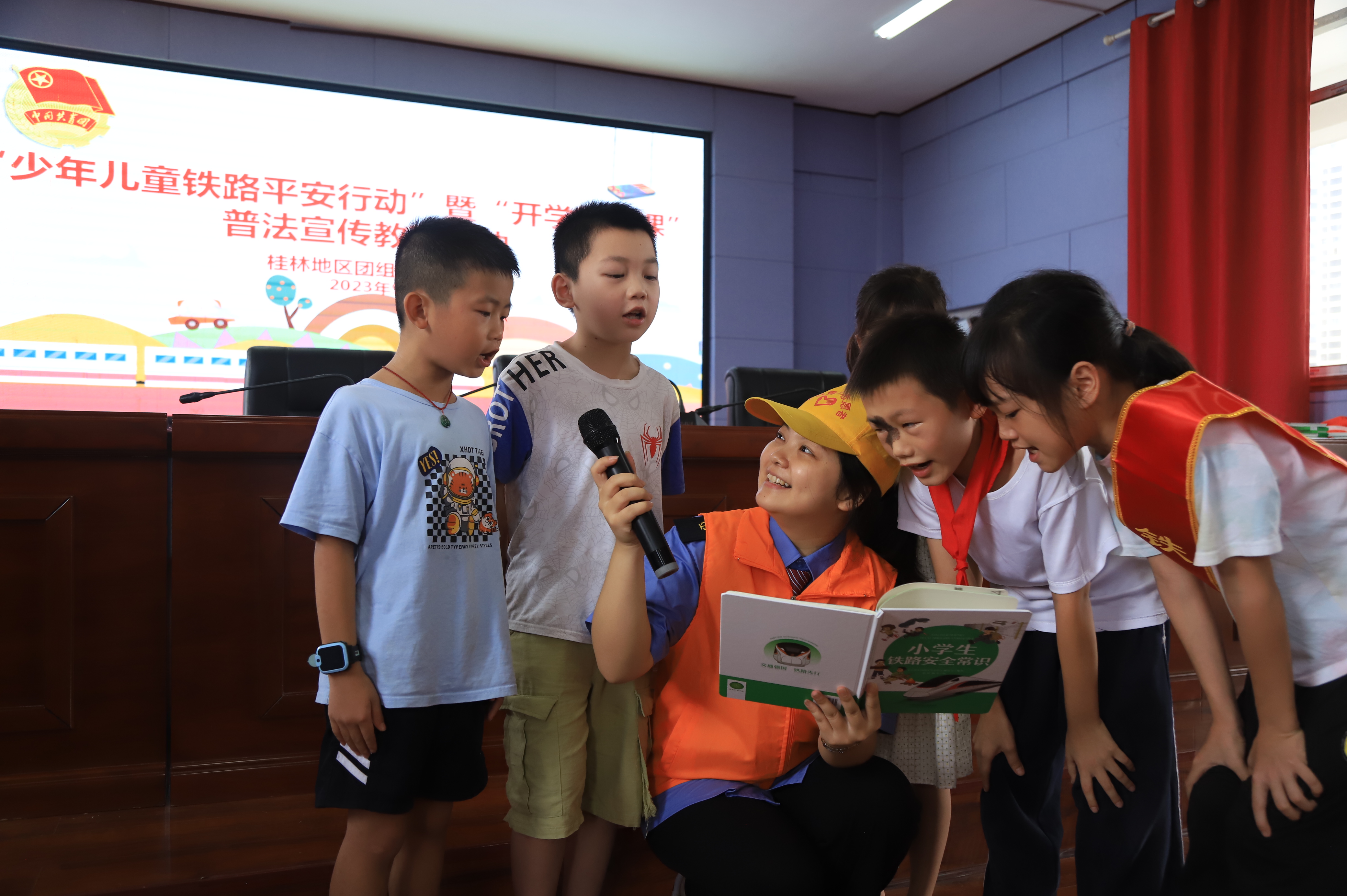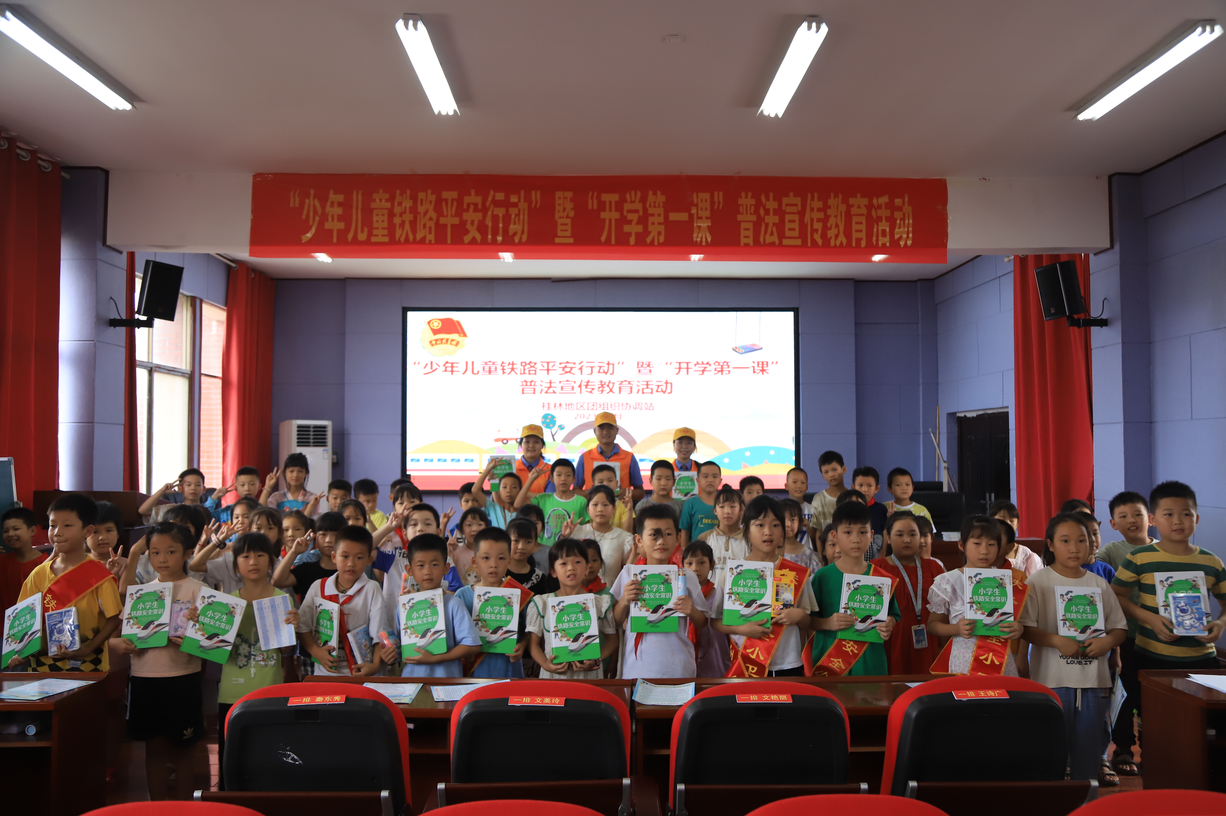 近日,桂林工务段组织志愿者联合地方护路办、铁路派出所,车站。在沿线小学开展“少年儿童铁路平安行动”暨“开学第一课”普法宣传教育,通过护路宣讲、知识问答、安全宣誓等方式进行铁路安全宣传,共同营造良好路外安全环境。