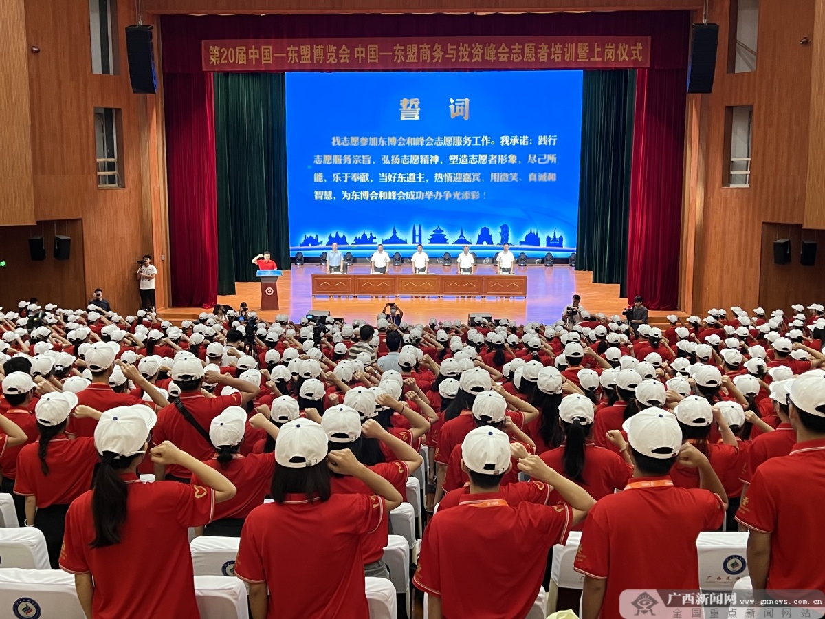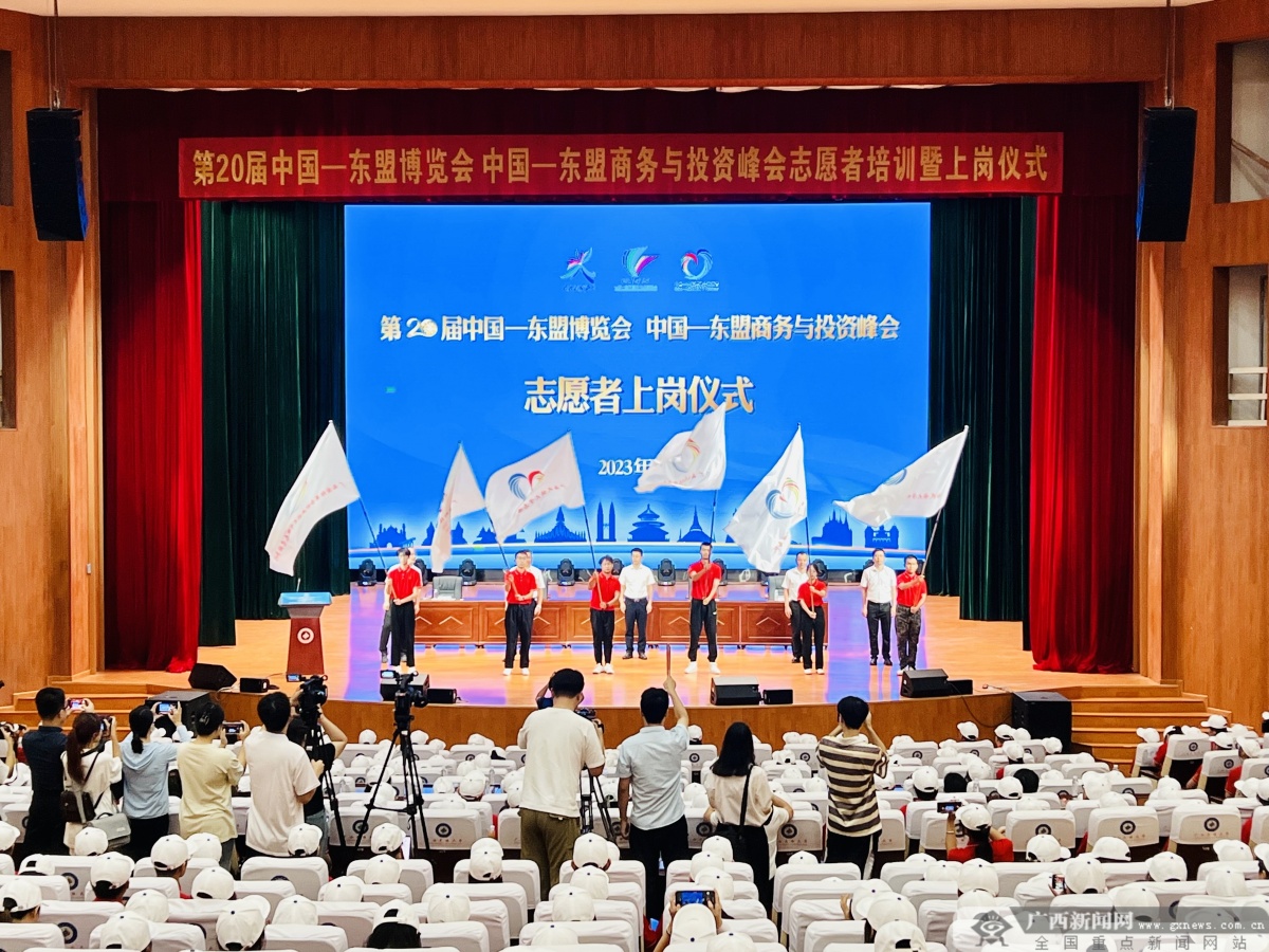 广西新闻网南宁9月8日讯(记者 陶昌顺 实习生 焦宇欣)9月8日,由共青团广西区委、自治区教育厅、广西国际博览事务局共同举办的第20届中国—东盟博览会、中国—东盟商务与投资峰会(以下简称东博会和峰会)志愿者培训及上岗仪式在广西民族大学思源湖校区顺利举行。共青团广西区委副书记、东博会和峰会指挥中心统筹协调部副部长荣丽伟,广西国际博览集团有限公司党委委员、总会计师、东博会和峰会指挥中心接待工作部副部长莫轻思,广西民族大学党委副书记陈铭彬,自治区党委教育工委宣传部副部长、教育厅思政处副处长、高校团工委副书记胡寿鹏等领导出席仪式并为志愿者服务队授旗,各高校带队老师及1000余名志愿者参加了本次活动。