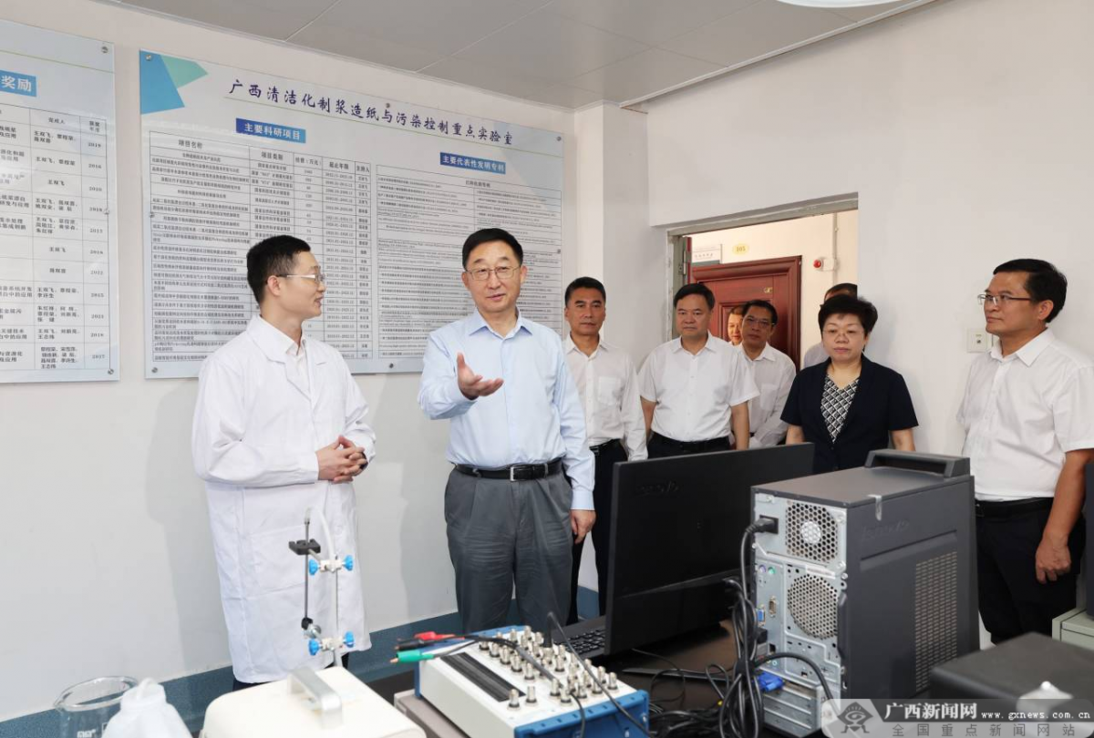 聂双喜教授在纸浆清洁漂白及先进纤维素功能材料方面取得系列原创性成果,为我国造纸行业可持续发展作出了贡献。在广西大学轻工与食品工程学院实验室、电镜室、核磁共振室等地,刘宁详细了解聂双喜工作生活情况,实地察看了纸浆清洁漂白技术研发、制糖过程高效生产体系关键技术研发等情况,充分肯定聂双喜带领团队取得的成绩,希望聂双喜和广大青年科技工作者坚持“四个面向”,坚定敢为人先的创新自信,担当作为、求实创新、潜心研究,把论文写在八桂大地上,努力拿出更多有分量的研究成果,为建设新时代壮美广西和实现高水平科技自立自强作出更大贡献。