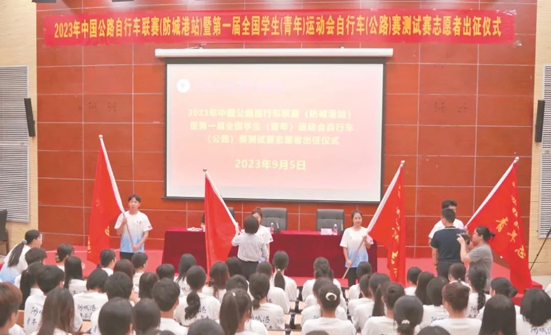 9月5日,由中国自行车运动协会、广西壮族自治区体育局、防城港市人民政府主办,防城港市文化广电体育和旅游局、共青团防城港市委员会、防城港市教育局承办的2023年中国公路自行车联赛(防城港站)暨第一届全国学生(青年)运动会自行车(公路)赛测试赛志愿者出征仪式在防城港职业技术学院图书馆报告厅举行,来自防城港职业技术学院的近300名赛事志愿者参加本次出征仪式。