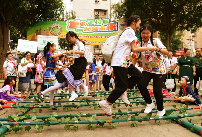中国与东盟的小伙伴在民主路小学共跳竹竿舞