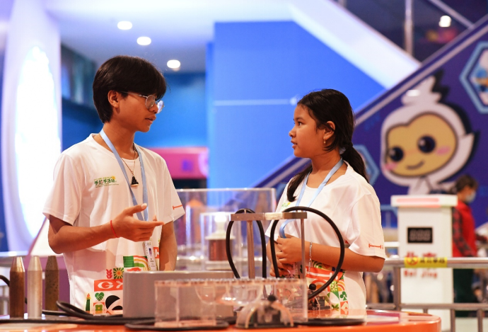 9月16日上午,“手拉手”的小伙伴们来到了广西科技馆。其中,“电磁大舞台”的电磁实验展示环节特别精彩!不过,来自柬埔寨的提米·库特利西萨(Thinnim Kuchrithisak)却显得没那么惊讶,因为他早就见过了类似的实验。他此刻正像一个小讲解员一样,向年龄较小的小伙伴解释着舞台上发生这些现象的原因。他还告诉我们,他长大后想成为一名技术工程师呢!