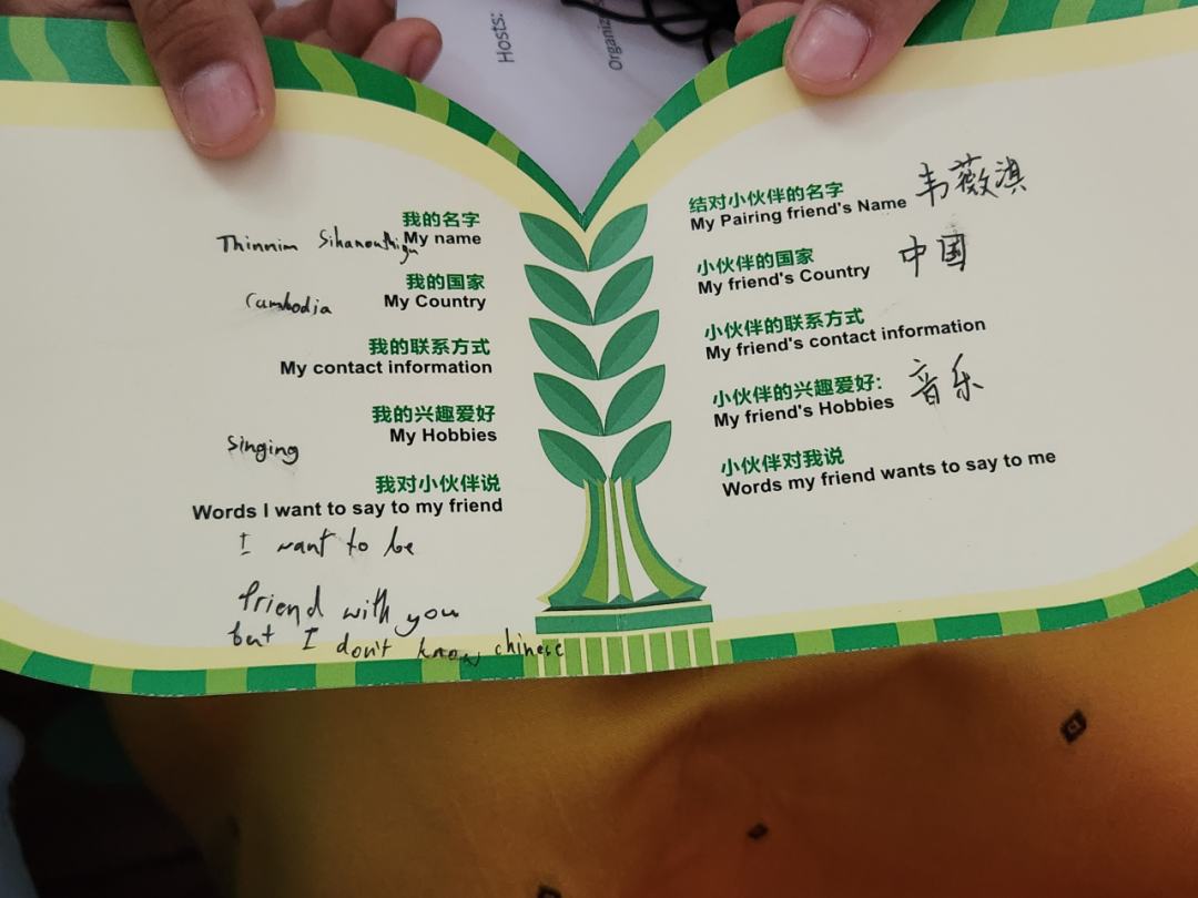 照片左边身穿黄色衣服的小女孩是来自柬埔寨的提米·斯函欧蒂亚(Thinnim Sihanouthiya),她认真地用英文写到:“我很想和你做朋友,可我不会说中文。”他的“结对子”小伙伴韦薇淇看了以后露出了甜甜的笑容,虽然语言不通,但是笑容永远是最通用的语言!很明显,这两个小伙伴已经用自己的方式成了好朋友!