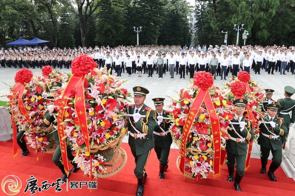 方阵前,以中共广西壮族自治区委员会、广西壮族自治区人大常委会、广西壮族自治区人民政府、政协广西壮族自治区委员会、驻桂解放军和武警部队、中共南宁市委员会和南宁市人民政府、首府各界群众名义敬献的7个花篮一字排开,花篮红色缎带上书写的“烈士永垂不朽”熠熠生辉。