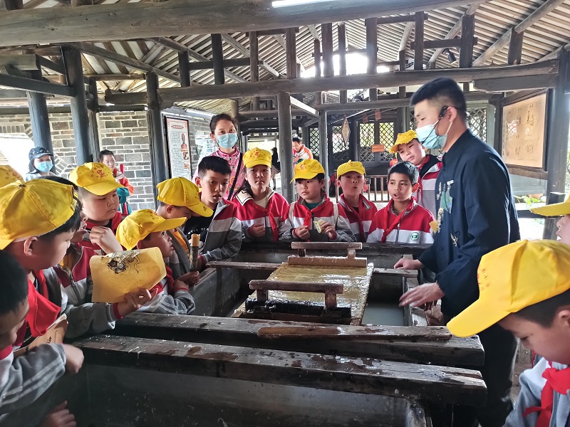 图为阳朔县白沙镇观桥小学少先队开展传承非遗文化研学活动——学习造纸术