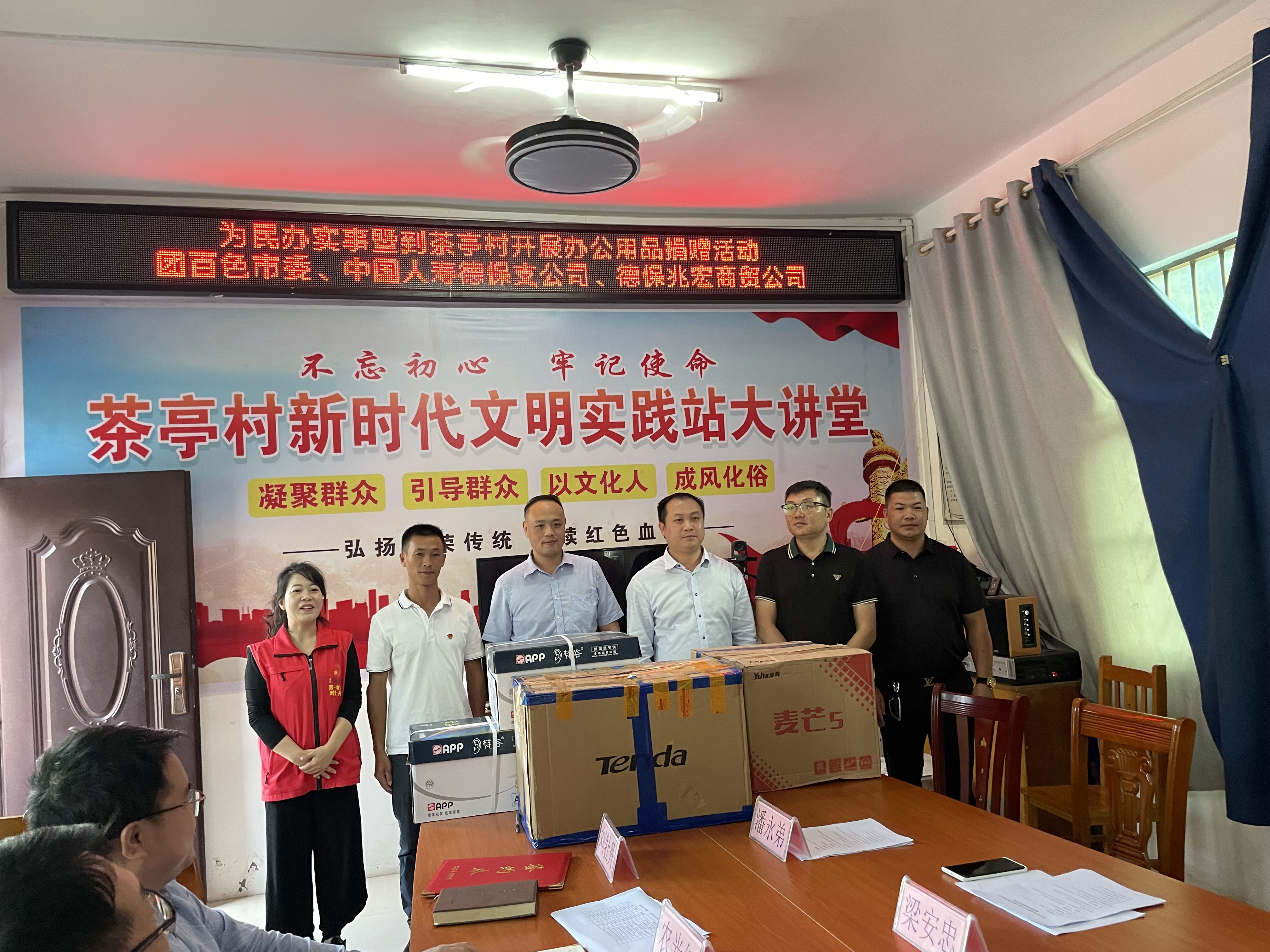 随后,市青年企业家协会与茶亭村股份经济联合社签订集体经济农产品采购协议,深化拓宽了全市团青平台实施消费帮扶渠道。共青团百色市委、市青年企业家协会、中国人寿德保支公司、德保兆宏商贸公司携手为茶亭村捐赠电脑、打印纸、矿泉水等办公、生活用品。