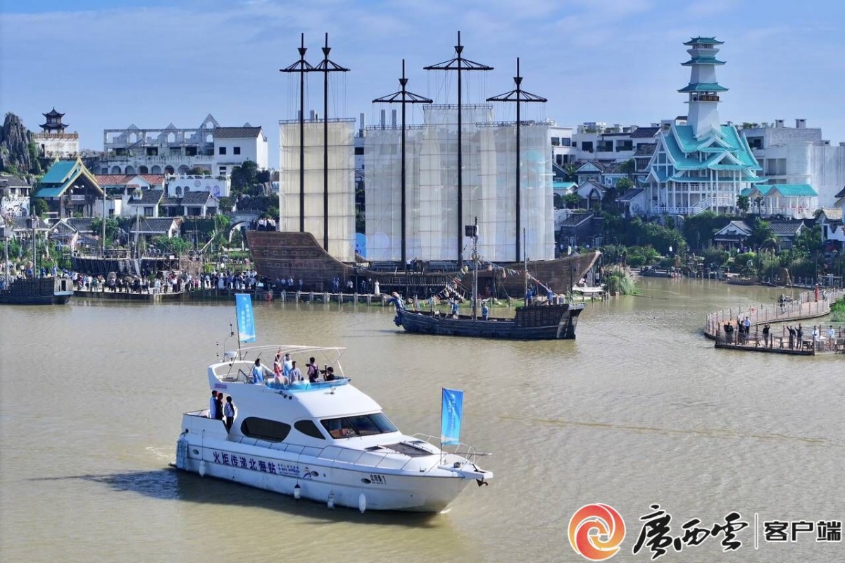 采火人采集火种从汉船走下来,14名圣火少女以道具形式呈现南珠形状,迎接圣火。广西日报-广西云客户端记者 周军 摄