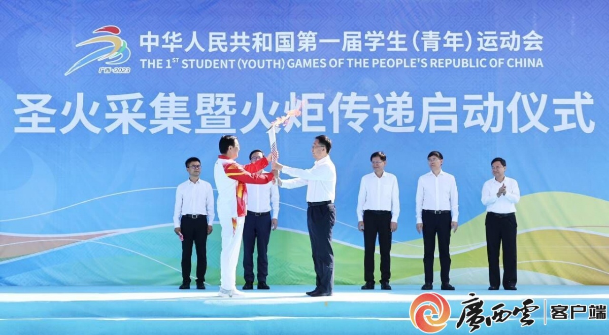 刘宁将点燃的第一届全国学生(青年)运动会火炬交给第1棒火炬手。广西日报-广西云客户端记者 邓华 梁凯昌 摄
