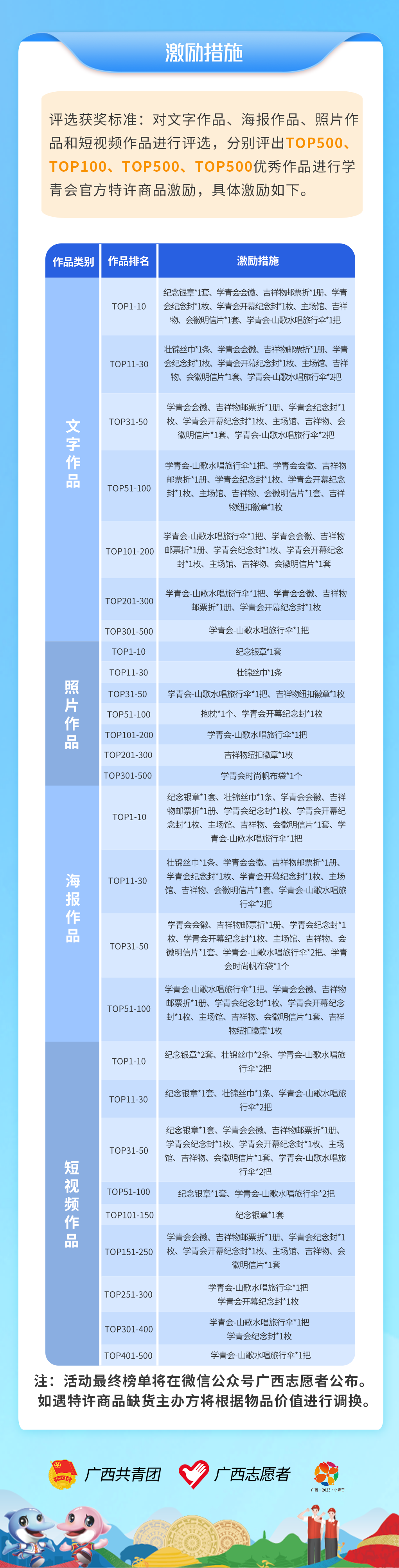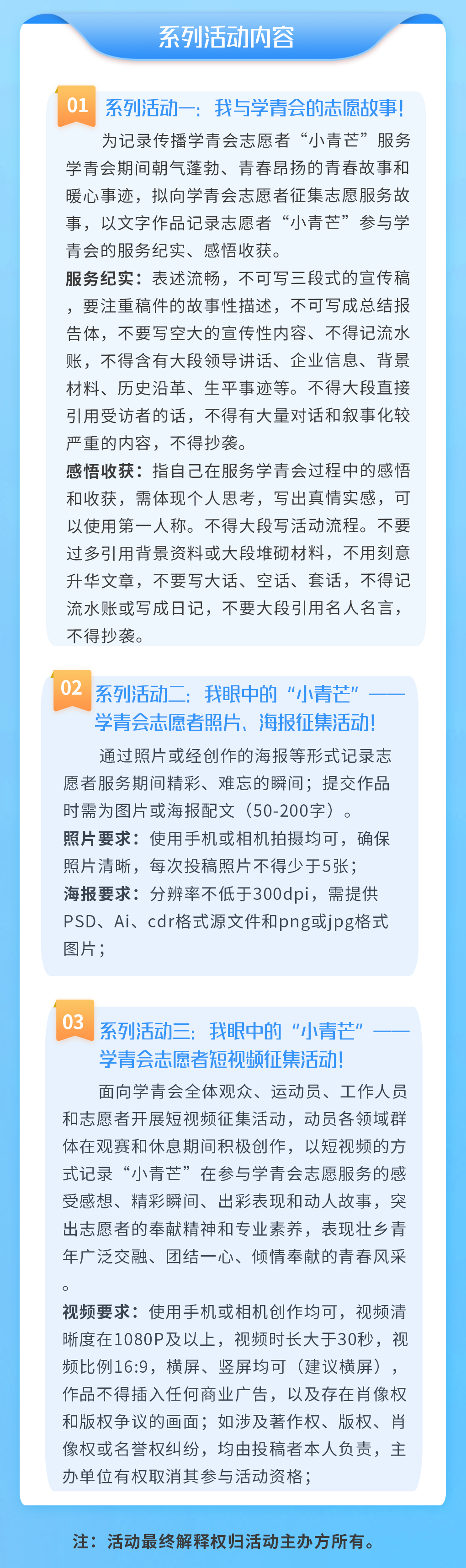 中华人民共和国第一届学生(青年)运动会(以下简称“学青会”)各项赛事正在如火如荼进行中,共青团广西区委、学青会执委会志愿者工作部联合开展第一届全国学生 (青年) 运动会志愿者系列主题活动。面向全体学青会志愿者和全社会征集学青会志愿者有关文字作品、照片海报、短视频等内容,并评选出500件优秀文字作品、500件优秀照片作品、100件优秀海报作品、500件优秀短视频作品,予以学青会特许商品激励。