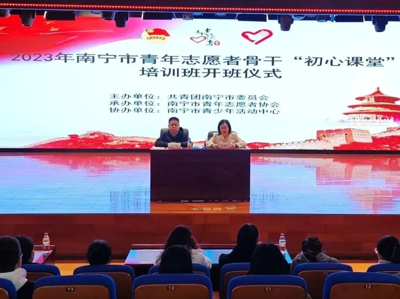 11月16日-17日,共青团南宁市委员会、南宁市青年志愿者协会在南宁市青少年活动中心(明秀总部)朱槿花剧场举办2023年南宁市青年志愿者骨干“初心课堂”培训班,来自南宁各县(市、区)青年志愿者团队的40余名志愿者骨干参与此次“初心课堂”。