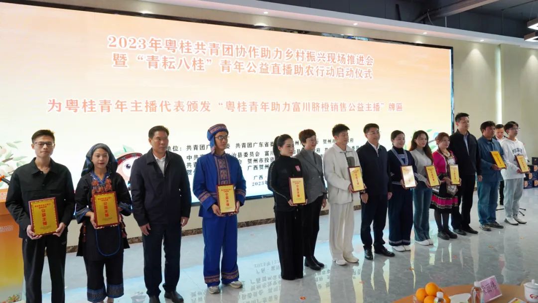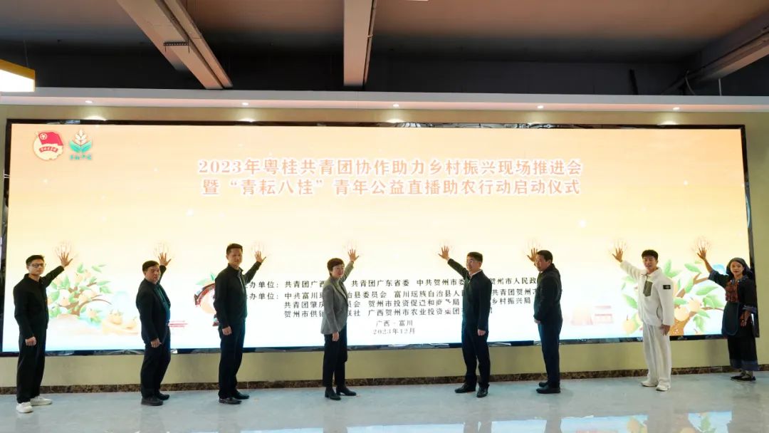 12月2日,2023年粤桂共青团协作助力乡村振兴现场推进会暨“青耘八桂”青年公益直播助农行动启动仪式在贺州市富川瑶族自治县成功举办,活动由共青团广西区委、共青团广东省委、中共贺州市委员会、贺州市人民政府主办,粤桂两地的优秀青年主播现场同步直播。