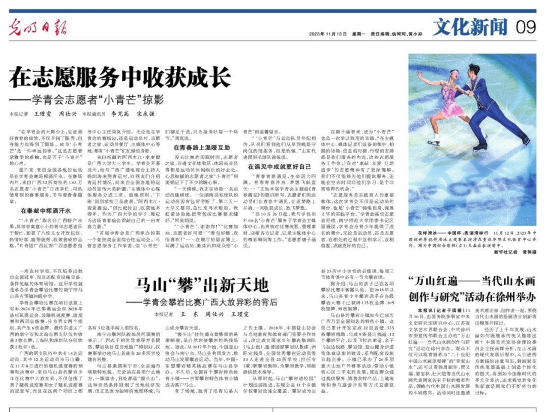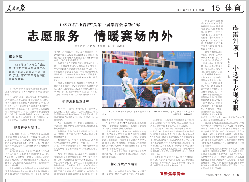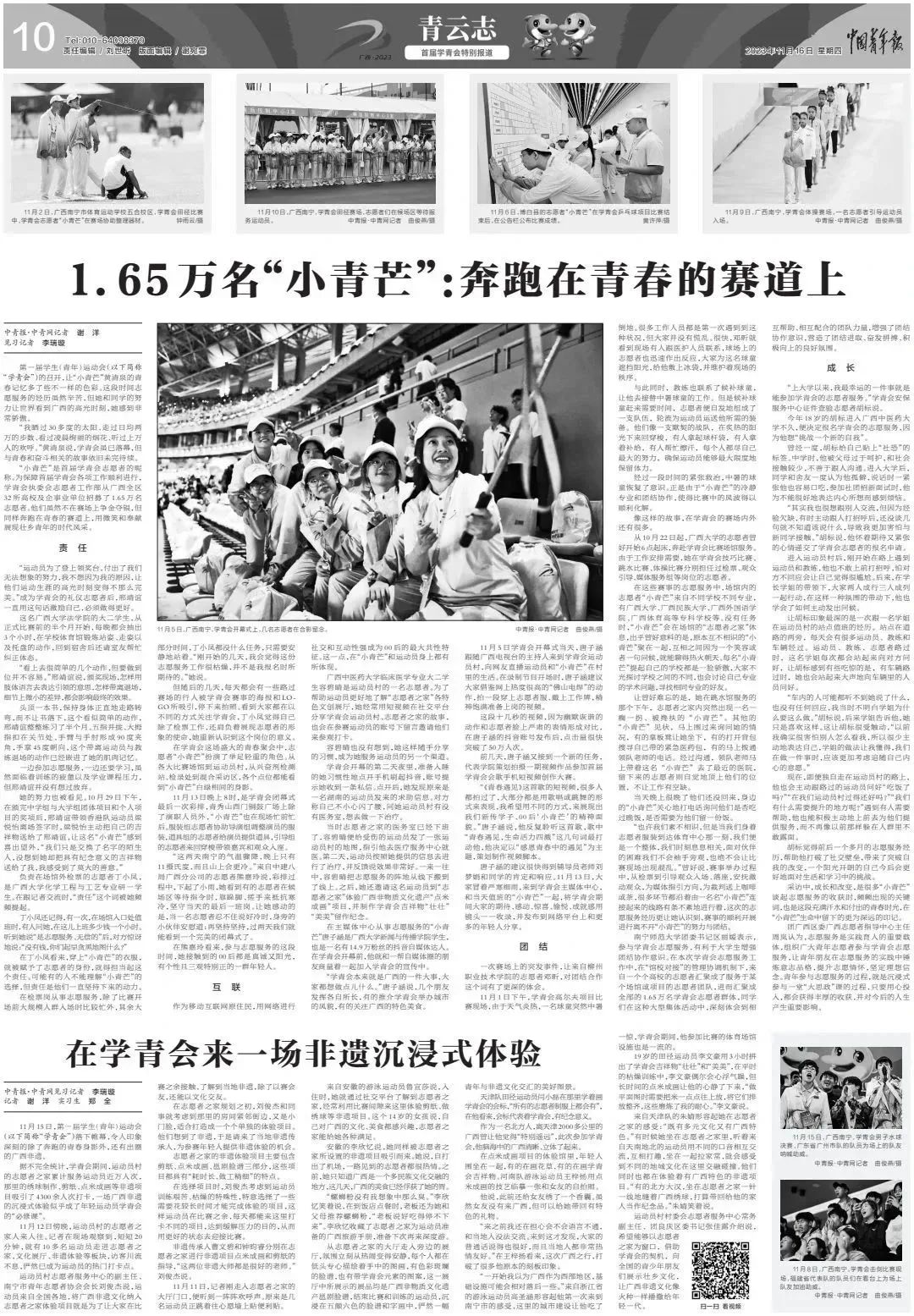 中国青年报等团属媒体集中推出学青会专题报道,中国青年报1个头版、1个整版、5个专版、1期特刊,通过采写消息、侧记、特写、评论、成果综述等进行了一系列鲜活报道,11月16日推出整版报道《1.65万名“小青芒”:奔跑在青春的赛道上》总结学青会志愿者“小青芒”的付出和成长收获,并传播展示广西民族非遗文化作出的积极贡献。