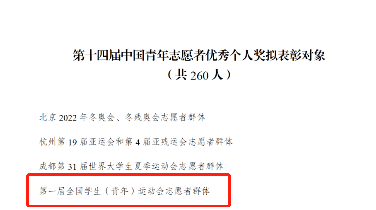 为充分发挥先进典型示范引领作用,激励和引导广大青年志愿者大力弘扬志愿精神,近日共青团中央、中国青年志愿者协会作出表彰决定,第十四届中国青年志愿者优秀个人奖、组织奖、项目奖结果揭晓,第一届全国学生(青年)运动会志愿者群体荣获第十四届中国青年志愿者优秀个人奖。