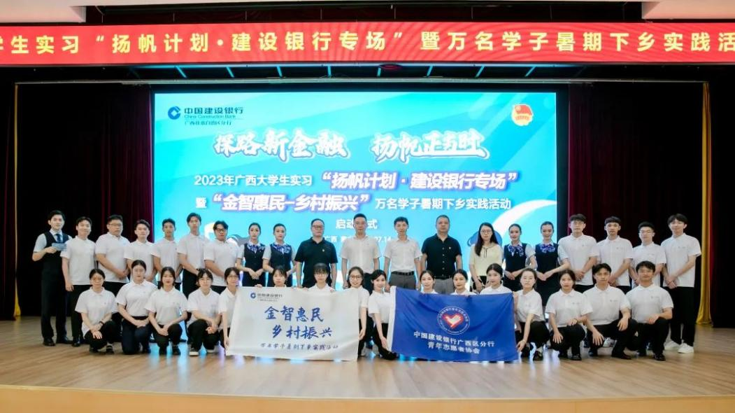 7月14日,2023年广西大学生实习“扬帆计划·建设银行专场”暨“金智惠民-乡村振兴”万名学子暑期下乡实践活动启动仪式在广西南宁举行(图源 青春建行)