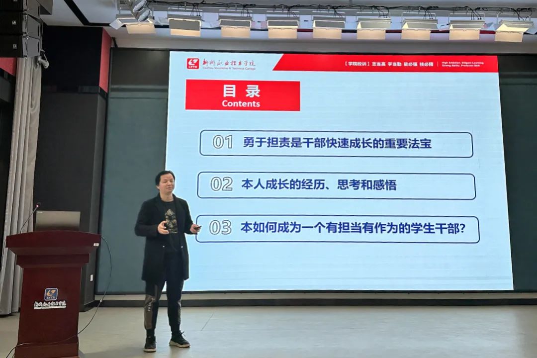 在柳州职业技术学院,该校学生工作处副处长蓝杜骞以《学生干部的责任担当》为主题,向在座师生讲述了他从一名普通学生成长为高等院校中层骨干的事迹报告,勉励在座师生要擦亮政治底色、坚定理想信念,坚持扎根基层、提升素质能力。