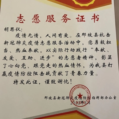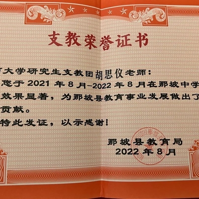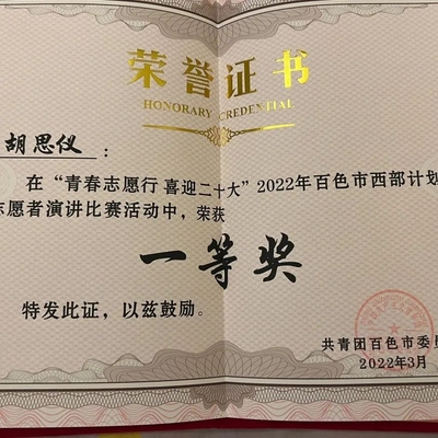 除了支教老师,胡思仪还有另外一个身份——西部计划志愿者。这一年,她参与了“七彩假期——与爱同行”暑期兴趣课堂志愿服务活动;那坡县口角村“七彩假期关爱留守儿童”活动;“温暖冬日——“姜”心相连”百林村扶贫助农调研活动;“多彩民族——达腊村彝族民俗调研活动”;百色那坡县抗击新冠肺炎疫情志愿服务活动;“重走边关路——寻边戍边体验活动”;那坡县共青团庆祝建团100周年宣传片配音录制活动;广西大学研究生支教团“青春心向党,筑梦新未来”那坡学子游学活动;这一年来她始终坚守初心,书写着作为一名西部计划志愿者的担当。
