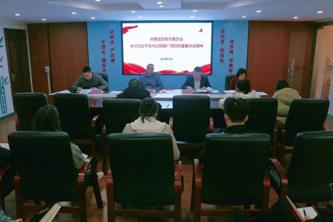 12月20日,共青团百色市委员会召开书记班子会议,集中传达学习习近平总书记视察广西时的重要讲话精神,团市委书记岳非平主持会议并组织学习,研究团市委贯彻落实举措。团市委全体干部职工参加会议。