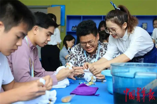 Zhang Shengjie (second from the right), a teenage boy from Indonesia, was experiencing the Chinese intangible cultural heritage project of tie-dye under the guidance of the teacher