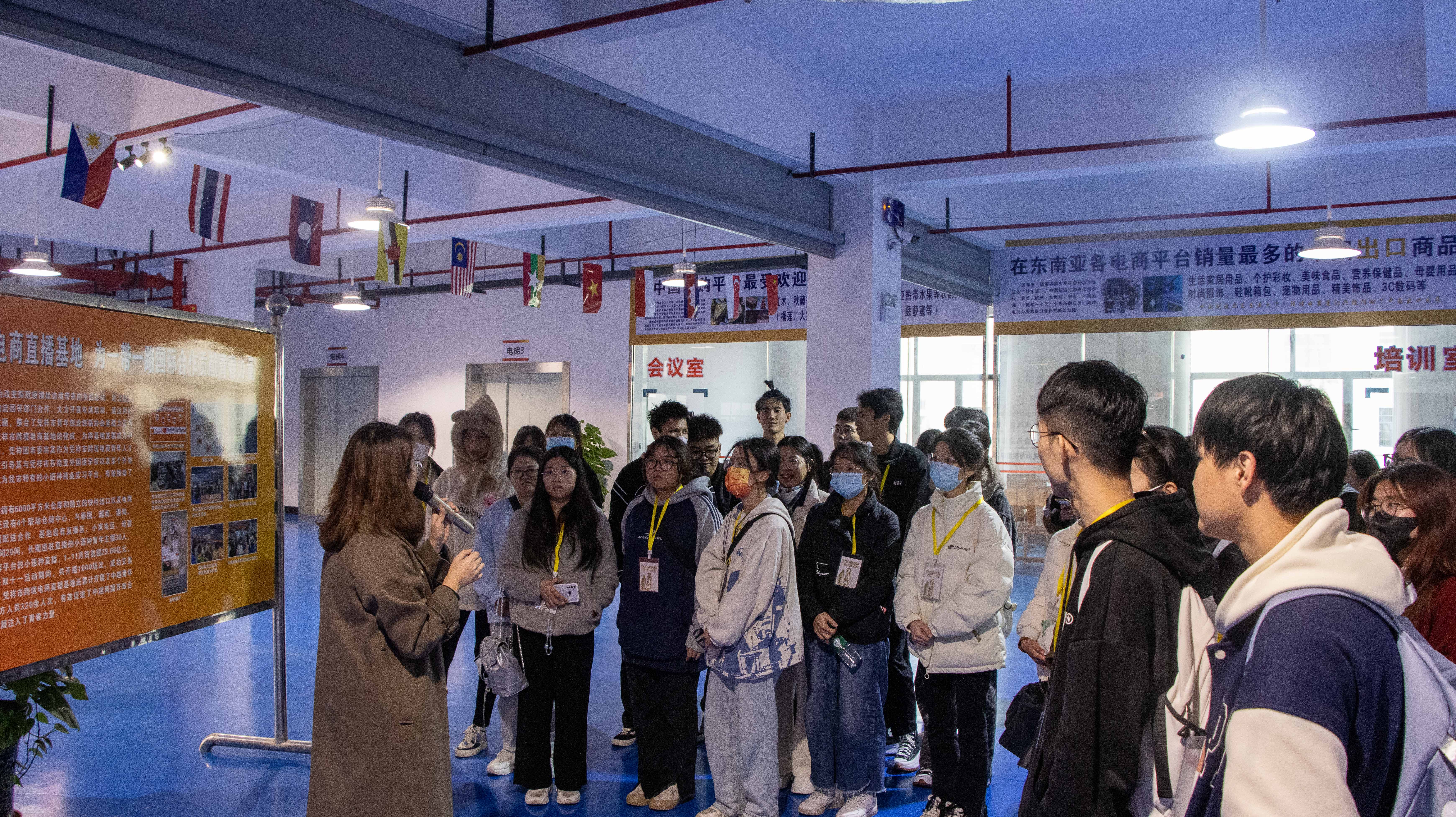 直播基地货架上小家电、日用品、服饰等商品琳琅满目,直播间的东盟主播们正通过手机向越南等东南亚网友直播展示推销。同学们认真地观看直播过程,对跨境直播很感兴趣。