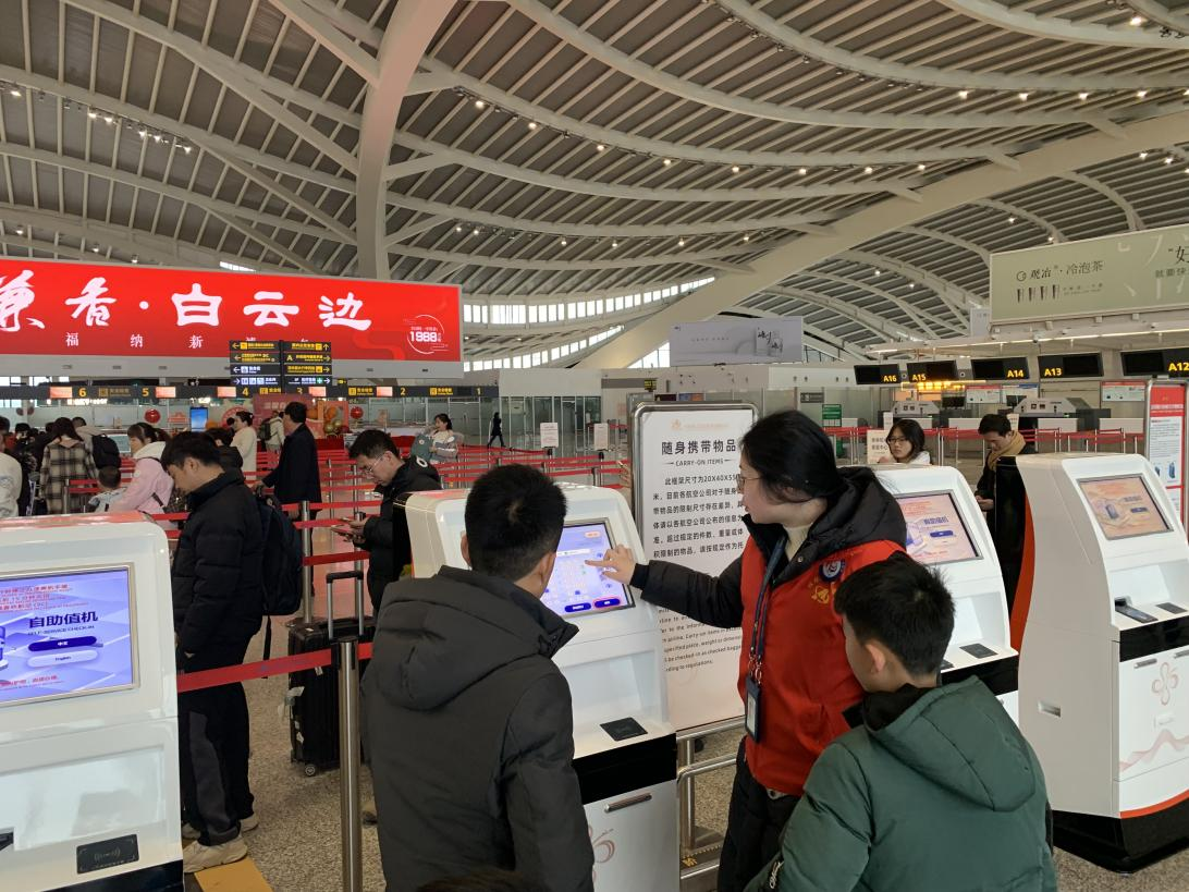 活动中,团员青年们身着志愿者马甲,为旅客提供引导问询,协助旅客使用自助值机设备及自助售票机购票等志愿服务,缓解一线员工压力、保障旅客顺畅出行。此外,志愿者通过发放“三超”行李宣传单, 普及安全乘机知识。