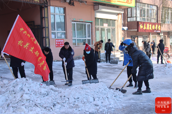 黑龙江省桦川县瞄准人居环境整治工作重点,引导居民树立“共建美丽宜居乡村”的主人翁意识,切实提升乡风文明“外在美”助推乡风文明建设,为乡村振兴赋能增效。图为该县党员干部开展清雪志愿活动。(黑龙江省桦川县纪委监委供 王宏宇 摄)