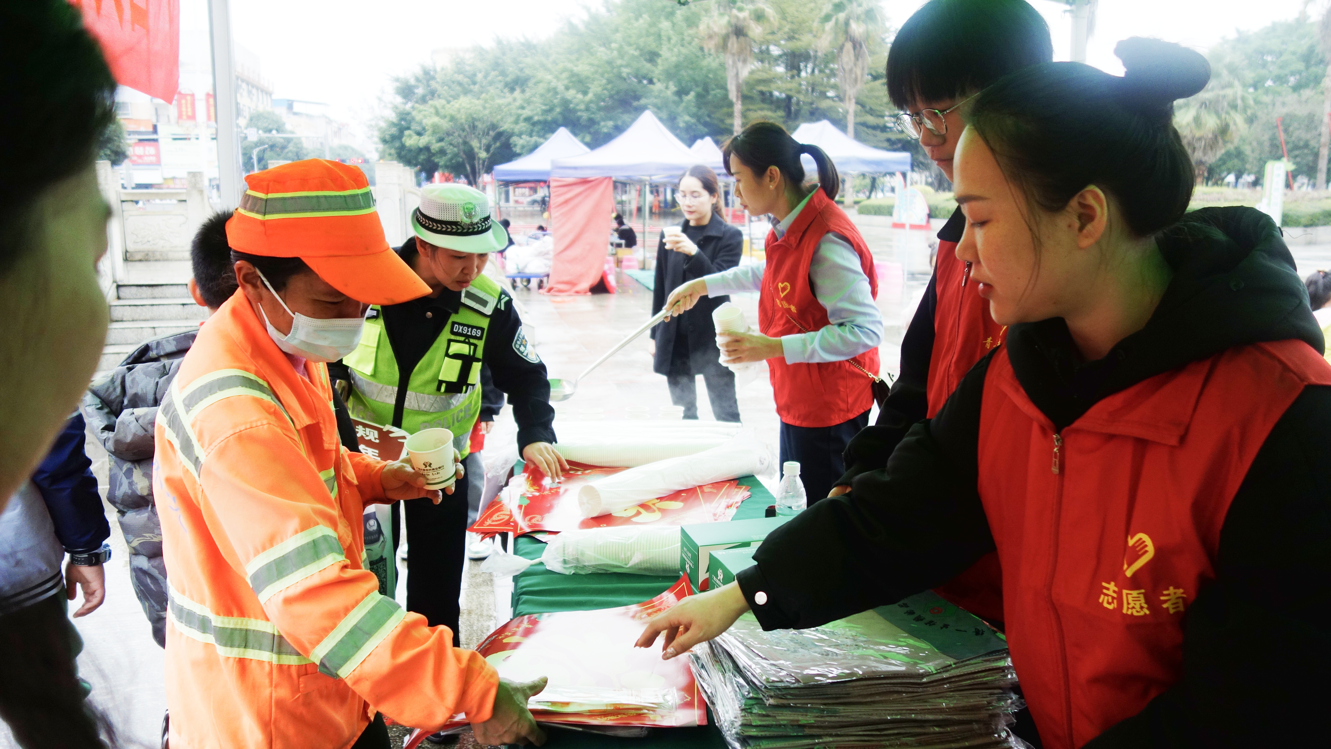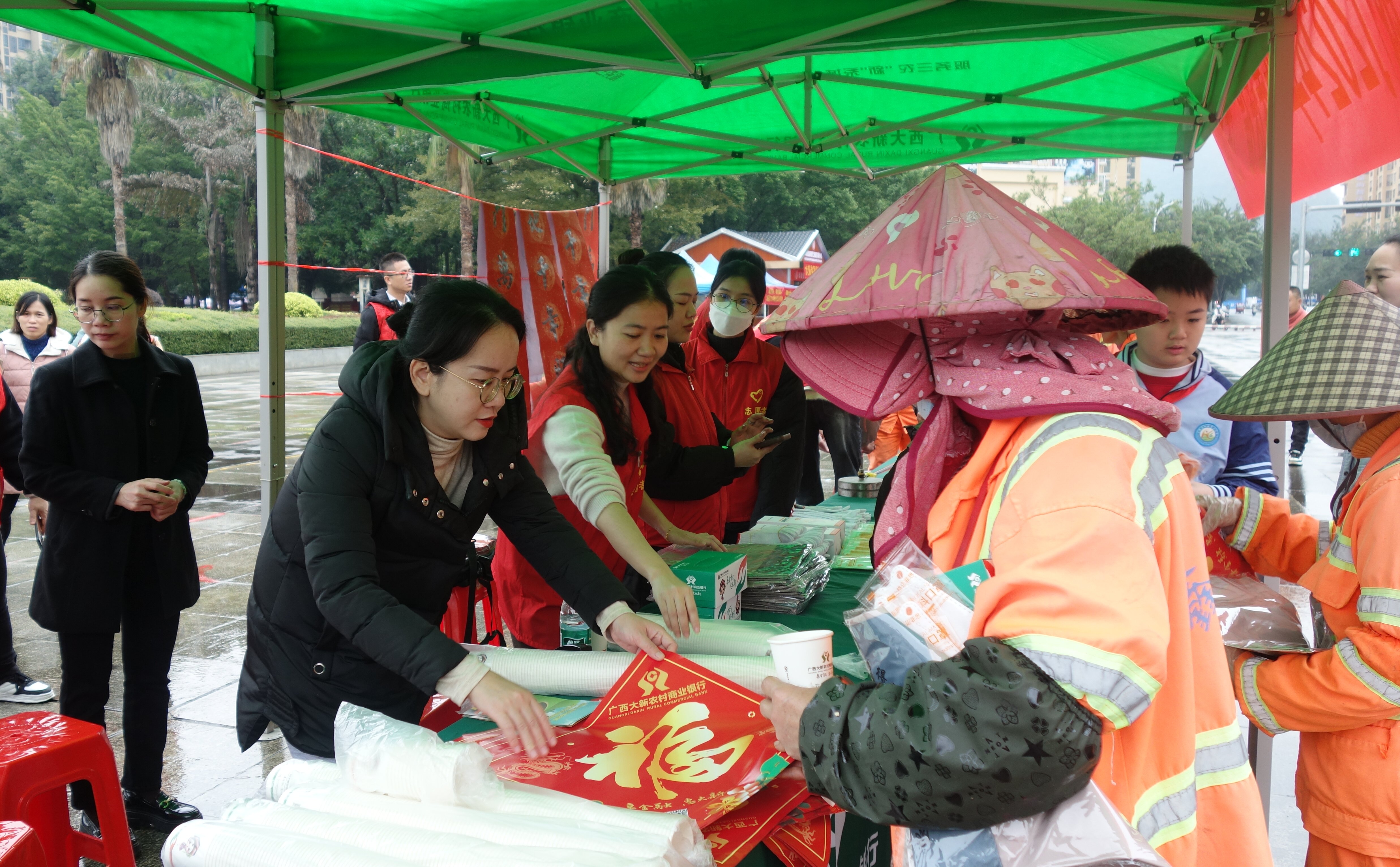 为营造喜庆、祥和的节日氛围,给环卫工人、交警、城管等一线劳动者送去温暖及祝福,2月1日团大新县委联合广西大新农村商业银行,组织青联委员、青年志愿者、少先队员开展迎新春送温暖志愿服务活动。
