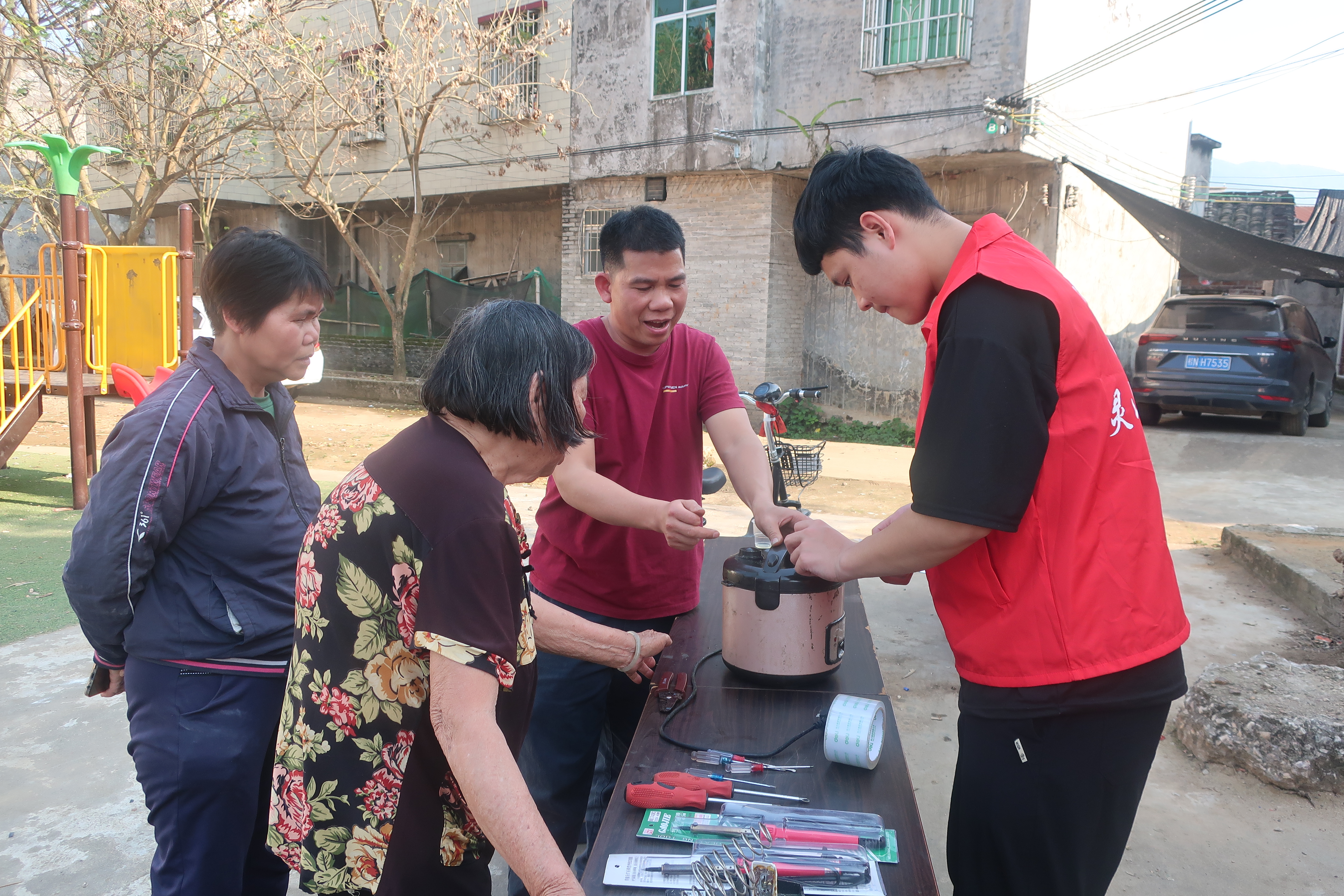 “叔叔,您的风扇开关坏了,我帮您换一个就好了”“奶奶,您洗衣机的线路坏了,我帮您修一下就好了”……活动现场,村民带来了热水壶、风扇、音响、洗衣机、电饭煲等故障家电,县职校志愿者用专业知识帮助村民维修家电,并耐心地向村民普及家电保养方法和安全用电知识。