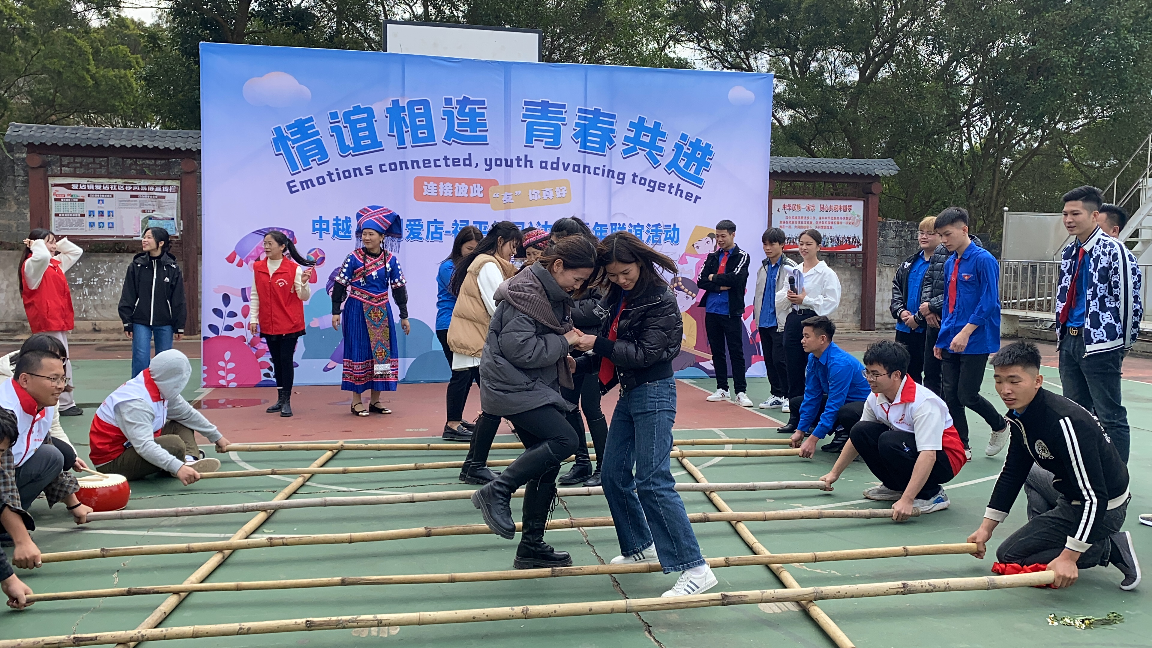 接着,在身着民族服饰的青年引领下,中越青年手牵手、心连心,踏着欢快的音乐节奏,共跳竹竿舞。