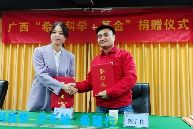 中国青年报客户端南宁3月13日电(中青报·中青网记者 谢洋)3月13日,广西“希望科学+基金”捐赠仪式在南宁举行。广西青少年发展基金会联合广西科技大学教师陈宇良设立“希望科学+基金”,倡导身边更多的人积极参与希望工程,为青少年提升素养播种科技希望。