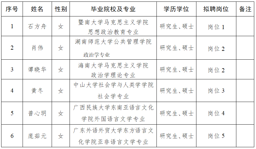 根据《广西团校〔中国(广西)国际青年交流学院〕2023年招聘重点领域急需紧缺高层次人才公告》的有关安排和规定,经公开报名、资格审查、面试、考核和体检等程序,拟聘用石方舟等6名同志为我校工作人员,现予以公示,公示期7个工作日(2024年3月18日至2024年3月26日)。