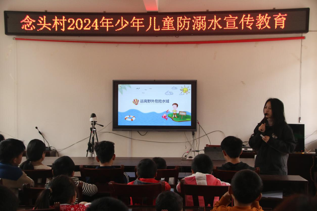 上午9点30,念头村的孩子们坐在念头村党群服务中心的会议室里,聚精会神地观看防溺水安全教育视频。广西大学研究生支教团的陈欣焕老师以近年来发生未成年人溺水事故案例警示孩子们,不要到私自或结伴到无安全设施、无救护人员的水域游泳。她还通过拉力实验教育孩子们,如遇有人溺水的危险情况,一定要及时向家长或专业人员寻求帮助,并为孩子们介绍了科学有用的救生工具。