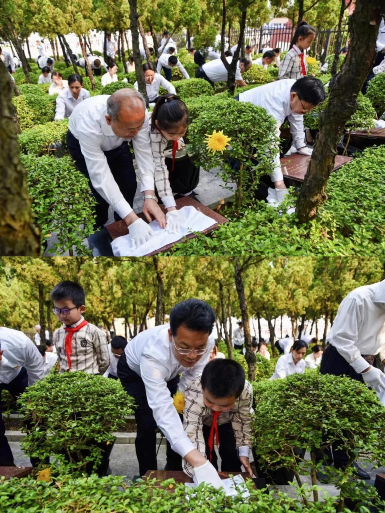 大家手持鲜花,缓步绕行纪念碑,瞻仰烈士英名墙后,来到烈士墓区,俯身于墓碑前,仔细擦拭墓碑,为每一座烈士墓献上鲜花,并行鞠躬礼,表达对先烈们的无限哀思和崇高敬意。