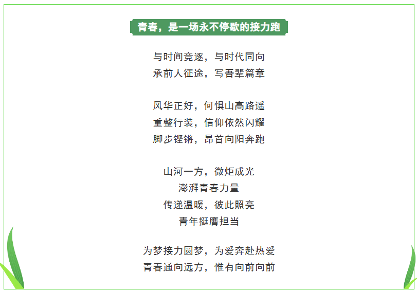 习近平总书记在纪念五四运动100周年大会上寄语青年:“一代人有一代人的长征,一代人有一代人的担当。建成社会主义现代化强国,实现中华民族伟大复兴,是一场接力跑。我们有决心为青年跑出一个好成绩,也期待现在的青年一代将来跑出更好的成绩。衷心希望新时代中国青年积极拥抱新时代、奋进新时代,让青春在为祖国、为人民、为民族、为人类的奉献中焕发出更加绚丽的光彩!”